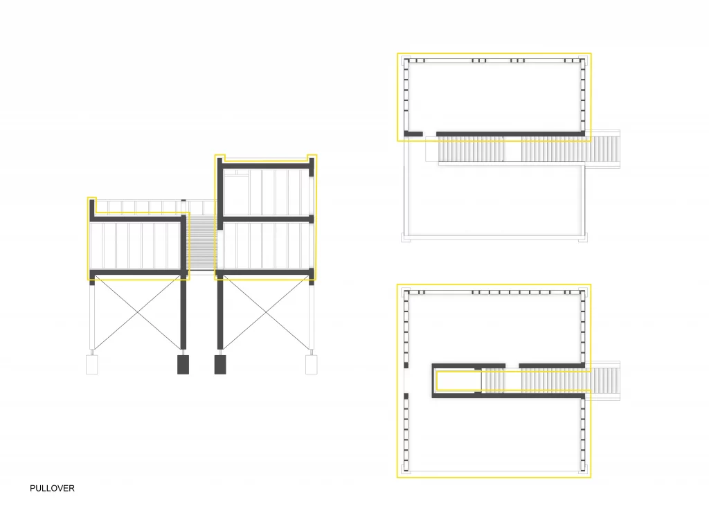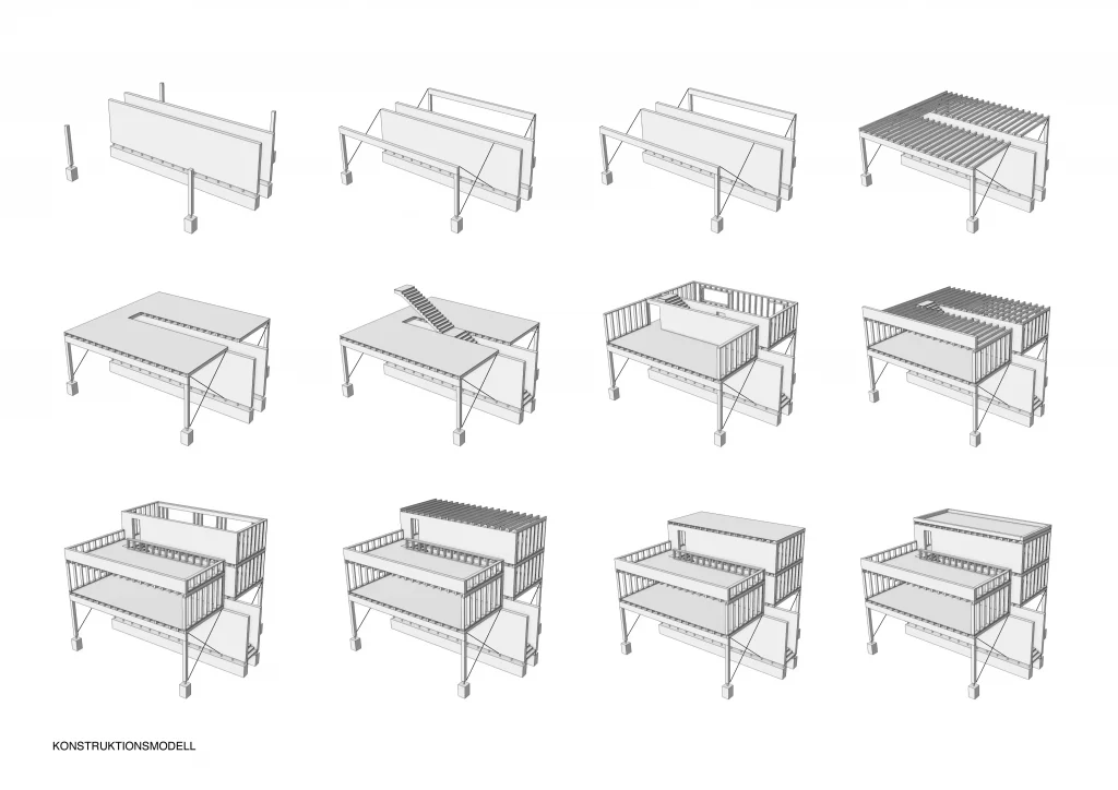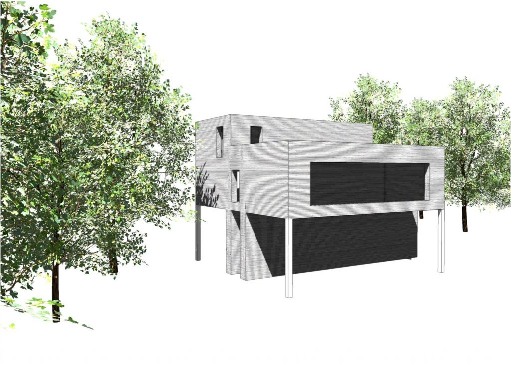 Das Baumhaus steht auf vier quadratischen Stützen sowie zwei Wandscheiben aus 30cm starkem Brettsperrholz. Mit der Grundfläche von 12×12 Metern bietet das Haus einen komfortablen Wohnraum über zwei Ebenen.