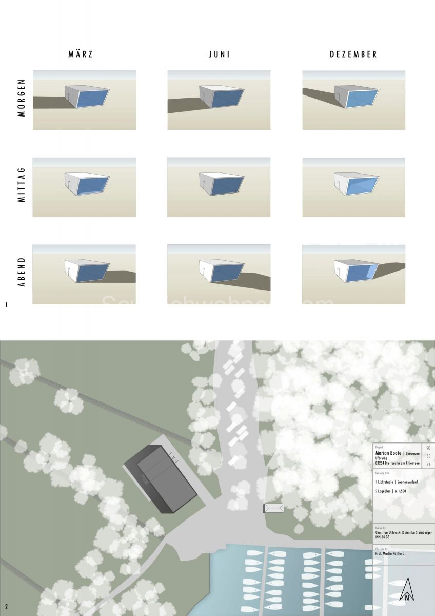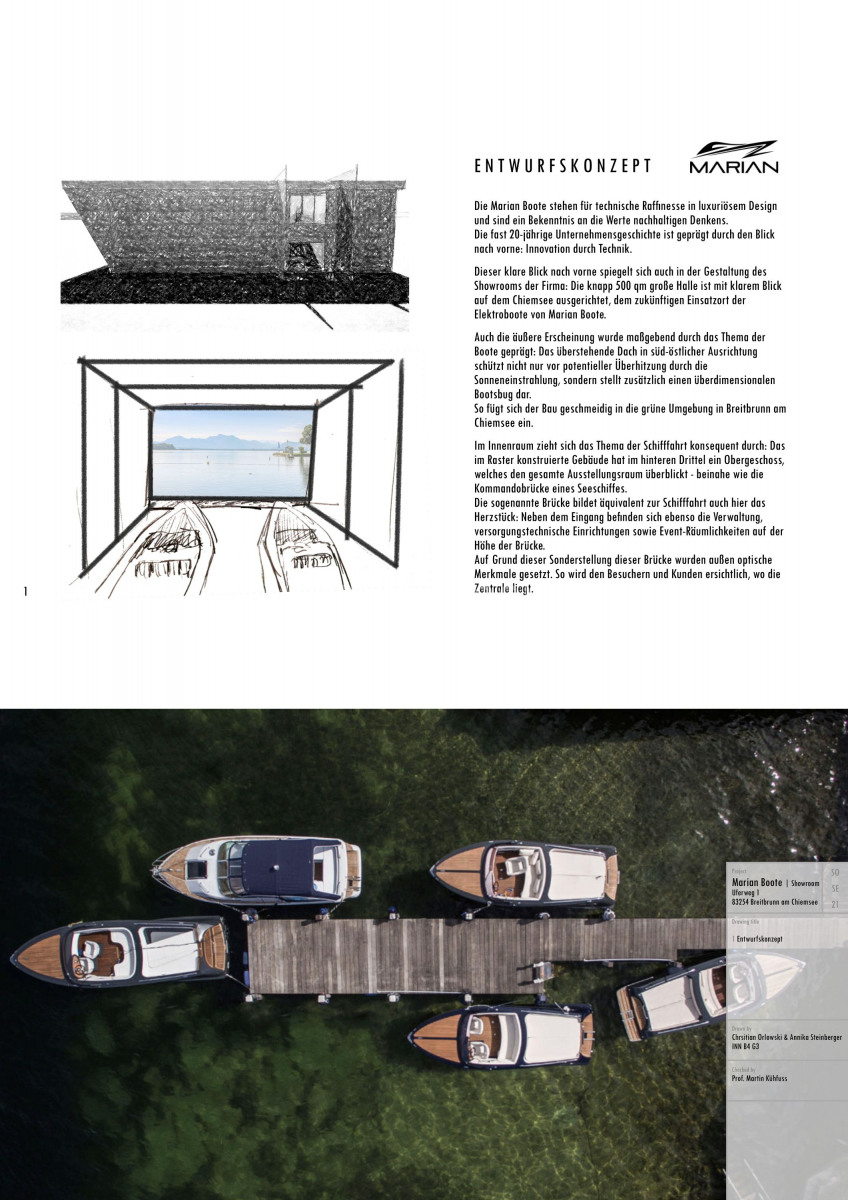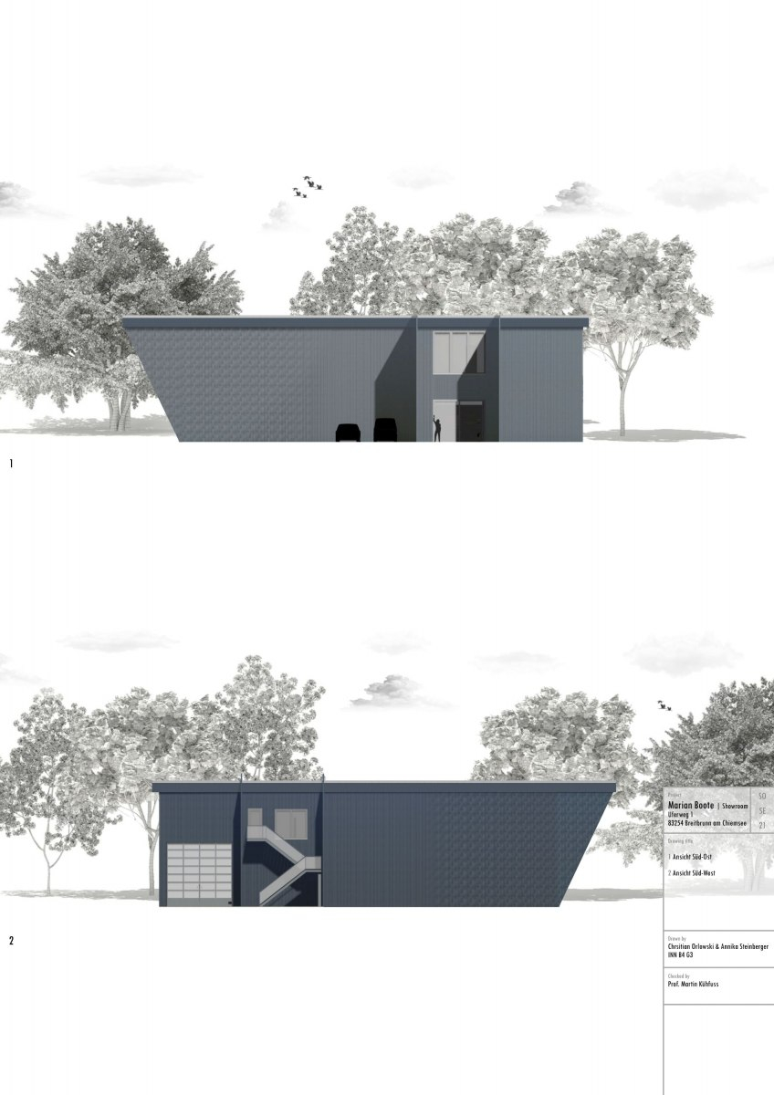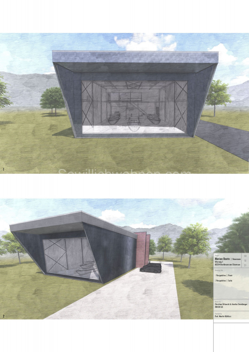 In Teamarbeit mit Annika Steinberger entwerfen wir ein Bootshaus, welches mit einer große Fensterfront direkt auf den Chiemsee gerichtet ist. Im Showroom kann man sich in eines der ausgestellten Boote setzen und den freien Blick auf den See genießen. So kann der Kunde einem Gefühl mit dem Boot unterwegs zu sein, bereits sehr nah kommen.