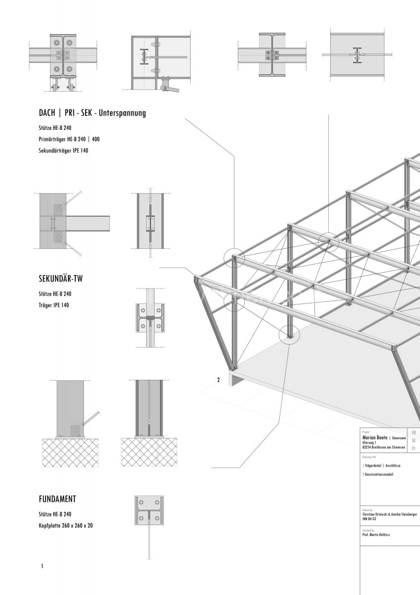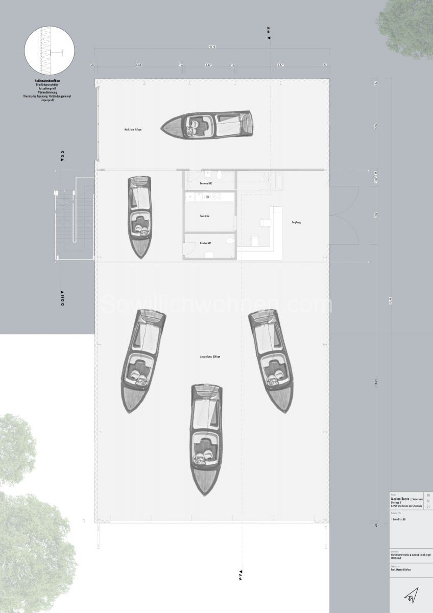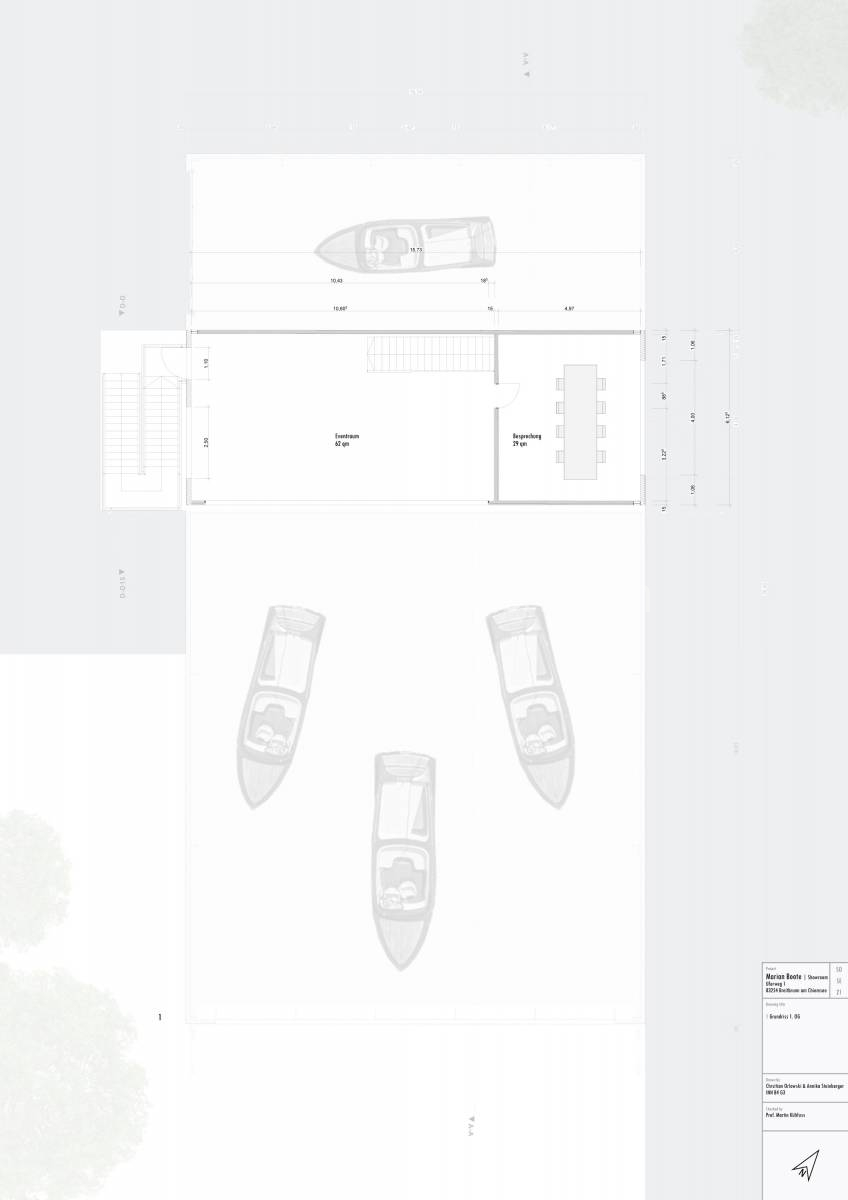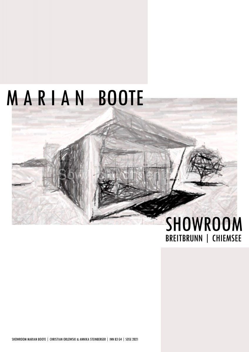 In Teamarbeit mit Annika Steinberger entwerfen wir ein Bootshaus, welches mit einer große Fensterfront direkt auf den Chiemsee gerichtet ist. Im Showroom kann man sich in eines der ausgestellten Boote setzen und den freien Blick auf den See genießen. So kann der Kunde einem Gefühl mit dem Boot unterwegs zu sein, bereits sehr nah kommen.