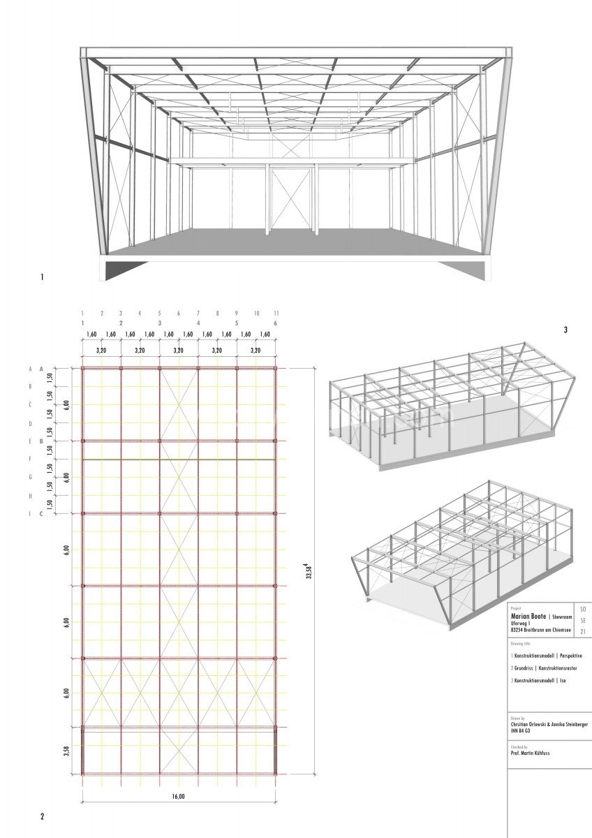 Der Showroom soll stützenfrei überspannt sein. Daran angegliedert soll ein abtrennbarer gläserner Werkstattbereich für ein Boot in den Entwurf eingefügt werden.