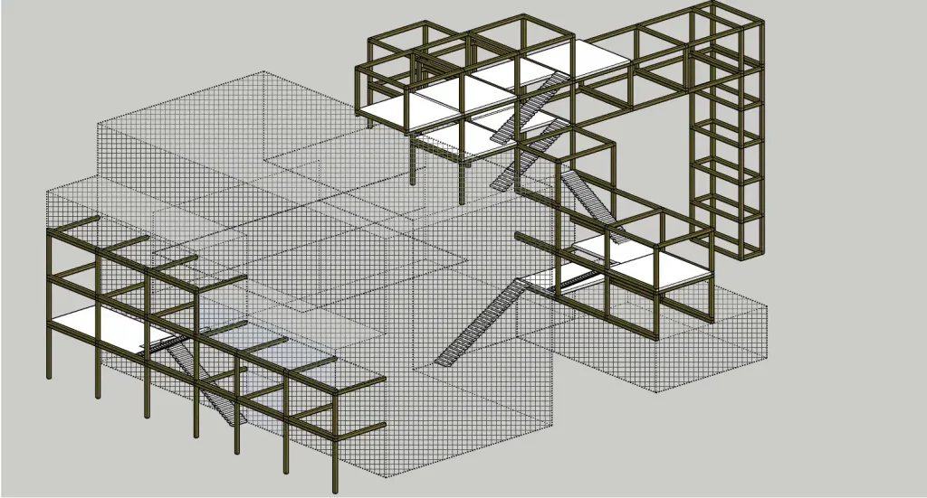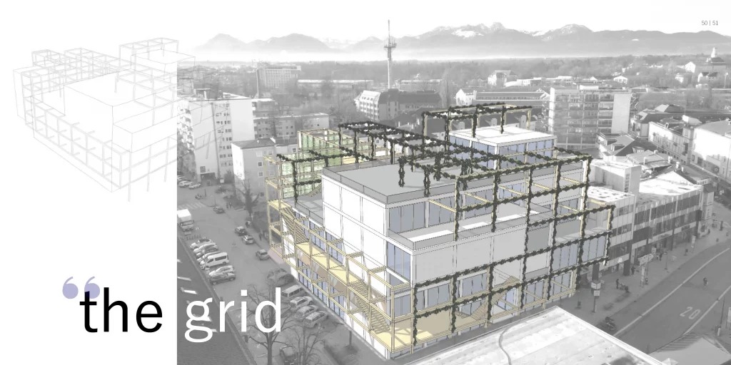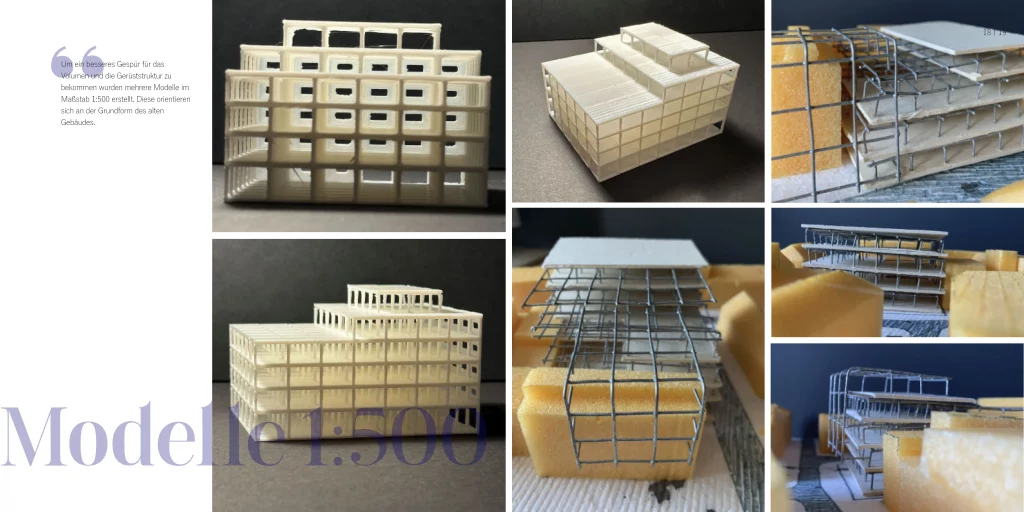 Ziel ist es, bei einem Umbau möglichst viele vorhandene Ressourcen zu erhalten und zu nutzen. Die Form des Bestandes wurde um mehrere Auskragungen erweitert. Auffallend ist das verwendete Gerüst, welches im Raster des Bestandes läuft und sowohl funktional als auch gestalterisch wertvoll ist. Die Konstruktion scheint hier das alte Gebäude zu umschlingen und zu ergänzen. Offen und Geschlossen bilden eine neue Symbiose. Auch im Inneren zieht sich diese Symbiose fort, sodass die Grenzen verschwimmen und mehr Freiheit der Kreativität gelassen wird. Es wird ein neues Raumgefühl geschaffen.