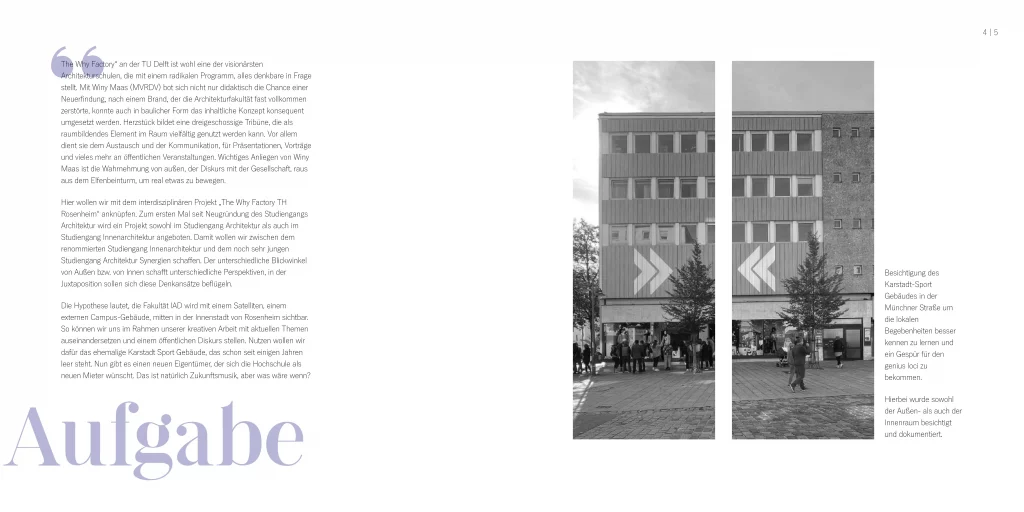 Die Hypothese lautet: Die Fakultät IAD der TH Rosenheim wird mit einem Satelliten, einem externen Campus-Gebäude, mitten in der Innenstadt von Rosenheim sichtbar. Die Studenten zeigen im Rahmen der kreativen Arbeit ihre aktuellen Themen und stellen sich einem öffentlichen Diskurs mit Passanten und Besuchern. Für das Projekt nutzen wir das ehemalige Karstadt Sport Gebäude, das schon seit einigen Jahren leer steht.