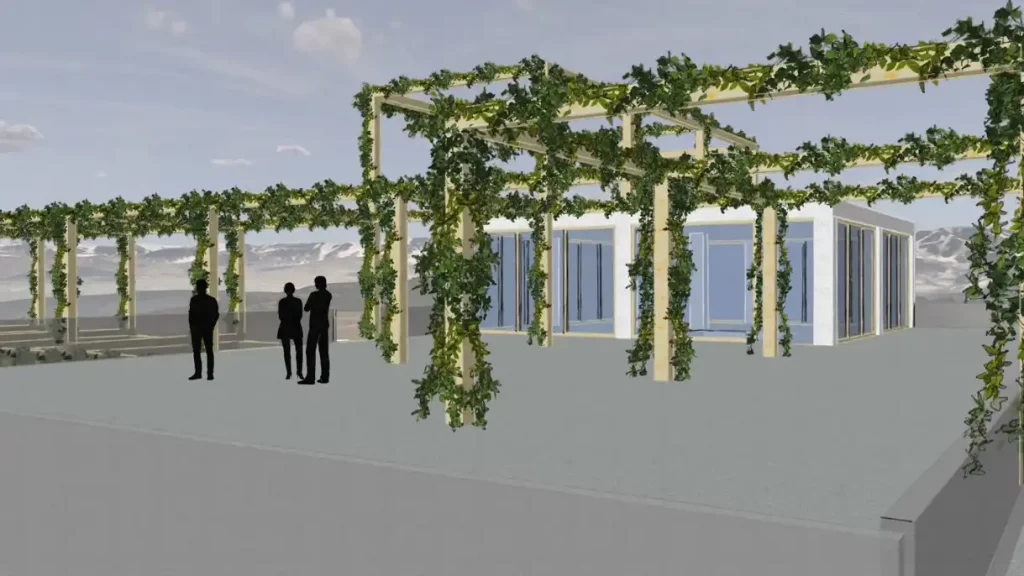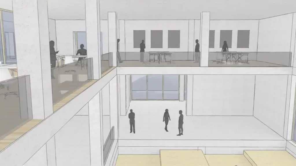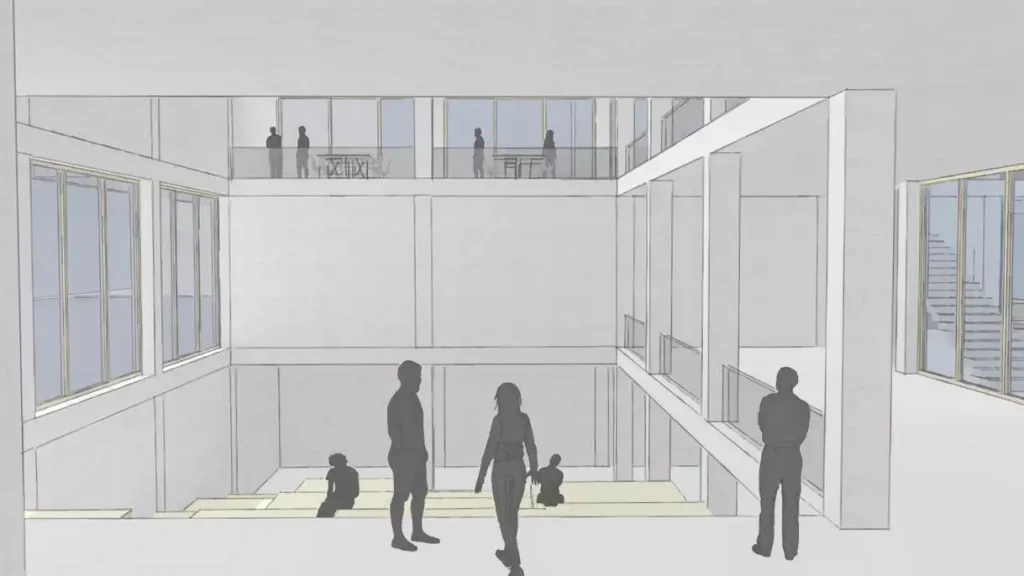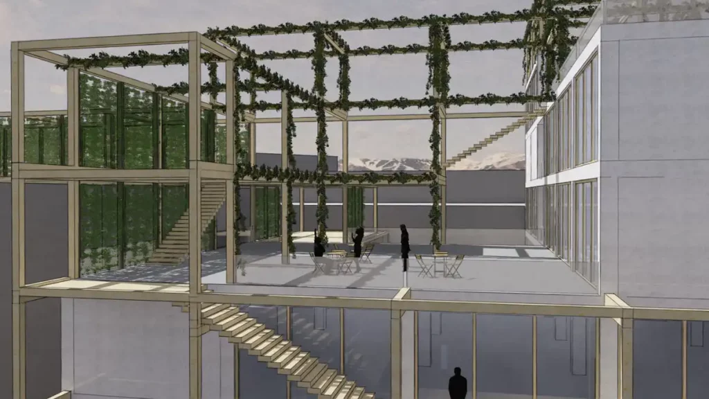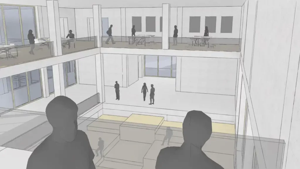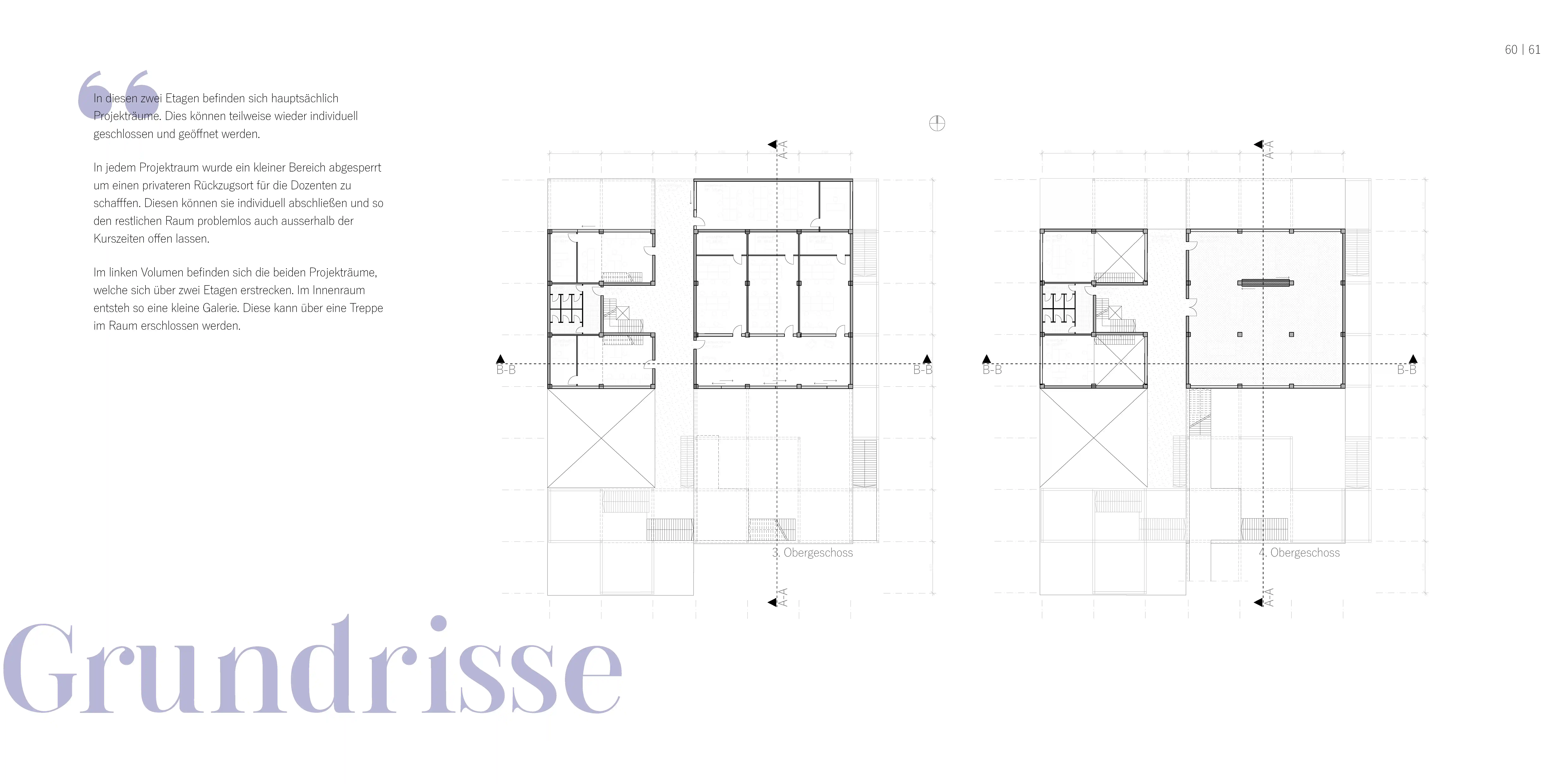 Ziel ist es, bei einem Umbau möglichst viele vorhandene Ressourcen zu erhalten und zu nutzen. Die Form des Bestandes wurde um mehrere Auskragungen erweitert. Auffallend ist das verwendete Gerüst, welches im Raster des Bestandes läuft und sowohl funktional als auch gestalterisch wertvoll ist. Die Konstruktion scheint hier das alte Gebäude zu umschlingen und zu ergänzen. Offen und Geschlossen bilden eine neue Symbiose. Auch im Inneren zieht sich diese Symbiose fort, sodass die Grenzen verschwimmen und mehr Freiheit der Kreativität gelassen wird. Es wird ein neues Raumgefühl geschaffen.