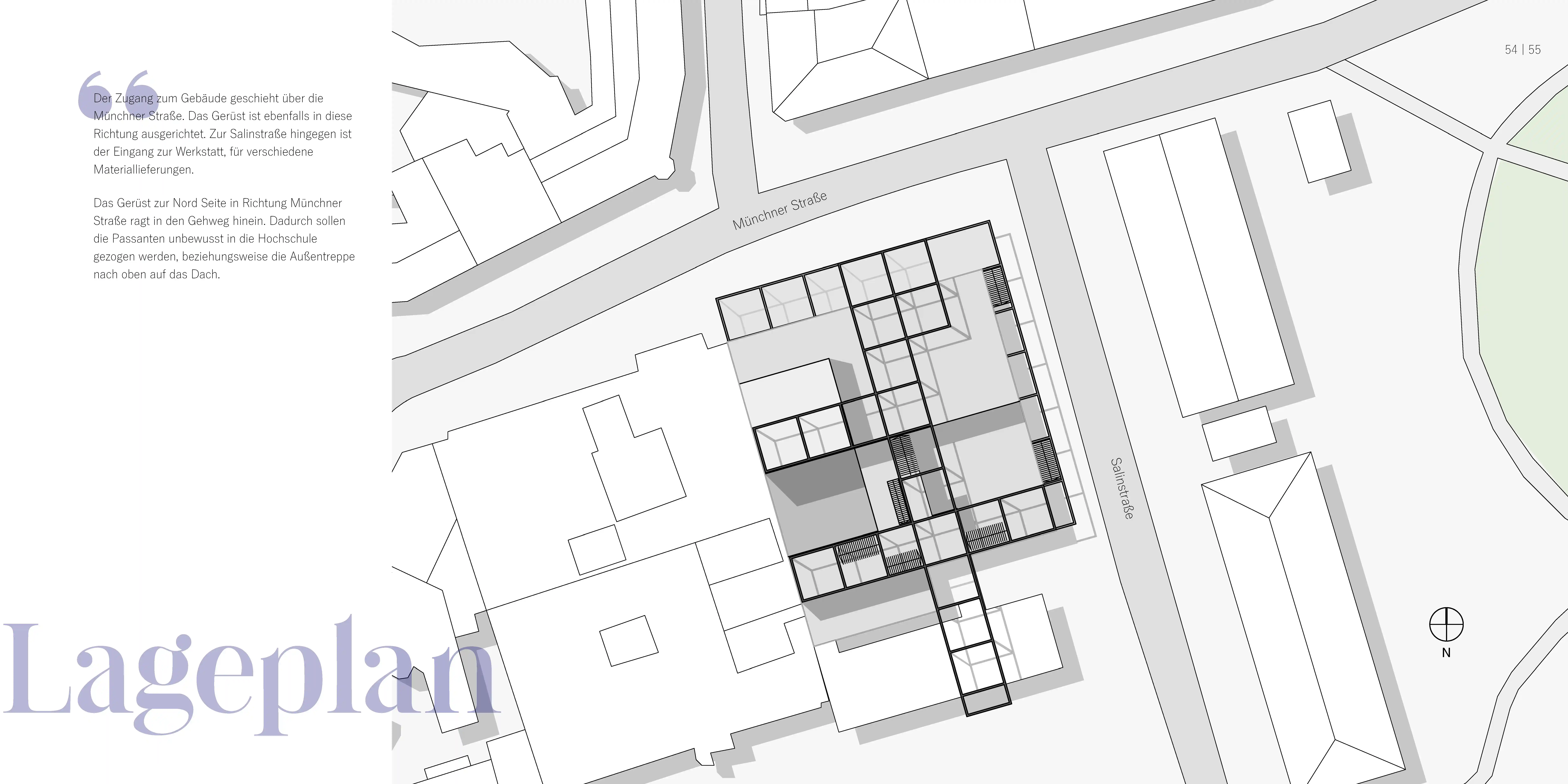 Ziel ist es, bei einem Umbau möglichst viele vorhandene Ressourcen zu erhalten und zu nutzen. Die Form des Bestandes wurde um mehrere Auskragungen erweitert. Auffallend ist das verwendete Gerüst, welches im Raster des Bestandes läuft und sowohl funktional als auch gestalterisch wertvoll ist. Die Konstruktion scheint hier das alte Gebäude zu umschlingen und zu ergänzen. Offen und Geschlossen bilden eine neue Symbiose. Auch im Inneren zieht sich diese Symbiose fort, sodass die Grenzen verschwimmen und mehr Freiheit der Kreativität gelassen wird. Es wird ein neues Raumgefühl geschaffen.