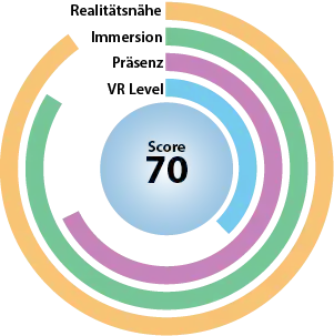 Basierend auf den Fragen des IGroup Presence Questionnaires und deren 7-stufigem Bewertungsskala habe ich den Immersion Score entwickelt. Der Score fasst die vier Untersuchungsfelder des IPQ in den Kategorien Realitätsnähe, Immersion, Präsenz und Virtual Reality Level zusammen anhand einer Skala (0-100%) zusammen. Je größer der Prozentwert des Scores ist, desto stärker und überzeugender ist die immersive Wirkung der bewerteten Umgebung in der Gesamtheit der vier Bewertungskategorien.