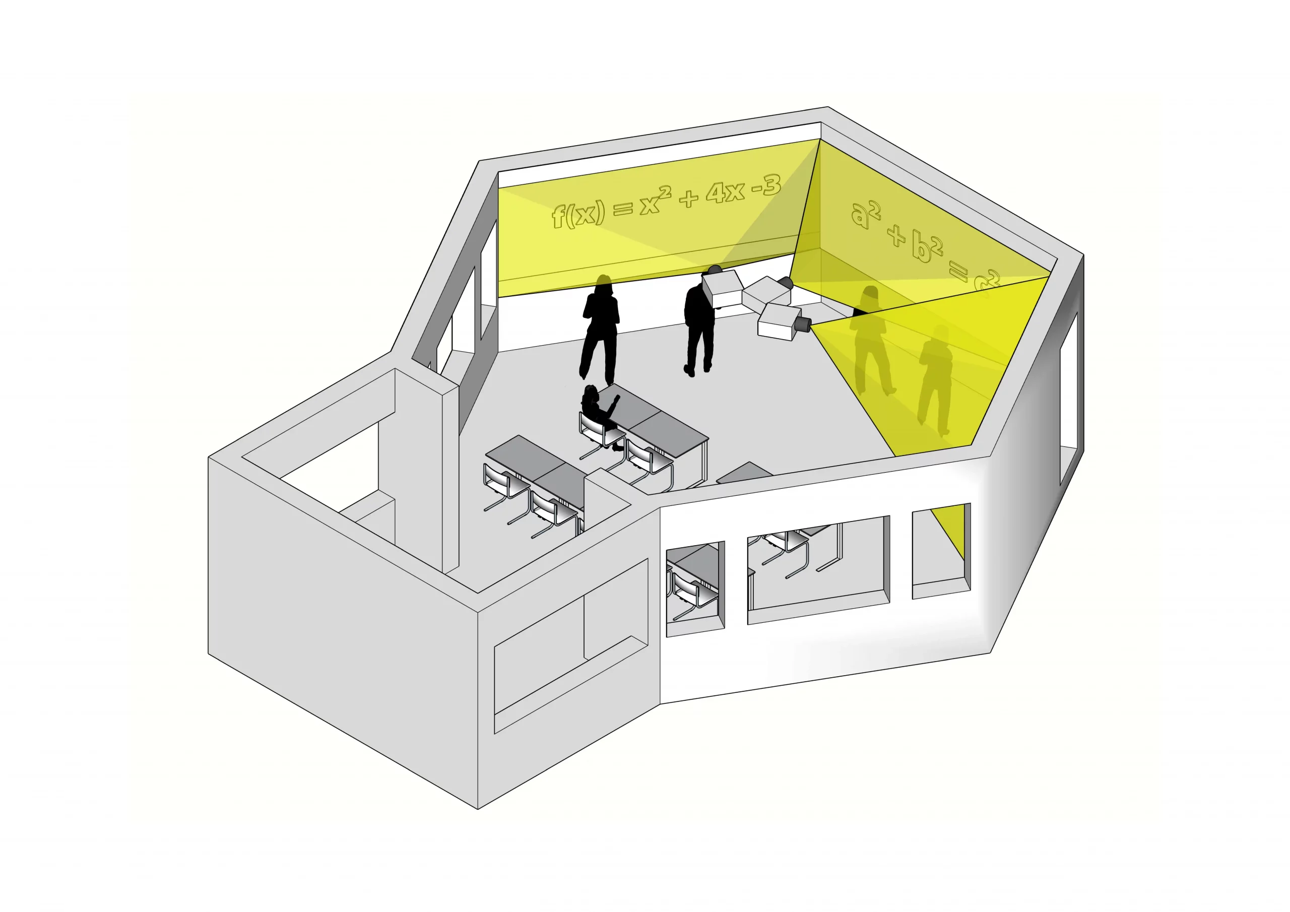 Die Möglichkeiten einer immersiven Raumgestaltung lässt sich an einem Beispiel verdeutlichen. In vielen Schulen wird der Unterricht, unabhängig vom Alter der Schüler, nach wie vor mit klassischen Methoden gestaltet: Frontalunterricht mit Hefteinträgen der Tafelbilder, begleitet von Arbeitsblättern oder kurzen Gruppeneinheiten. Eine Adaption von immersiven Elementen kann die Modernisierung der Lehre und Lernmethoden entscheidend voranbringen. Als Fallbeispiel dient die Walter-Gropius-Schule (WGS) im Süden Berlins, im Zentrum des Bezirks Gropiusstadt. Walter-Gropius entwarf die Schule mit fünf Pavillons und wabenförmigen Klassenzimmern, die jeweils um einen Gemeinschaftsraum angeordnet sind. Die dreigeschossigen sternartigen Bauten sind in nüchternem Sichtbeton errichtet und stehen inzwischen unter Denkmalschutz. Der Grundriss der Klassenräume ist wabenförmig mit einer rechteckigen Erweiterung im hinteren Teil. Schon im Entwurfskonzept war vorgesehen, dass der Unterricht ohne festem Klassenverband und mit offenen Lernformen gestaltet werden kann. Für den Einsatz der immersiven Darstellungstechniken bieten sich die vorderen drei Wände an. Die Projektionen können den Raum virtuell in eine Breitbild-Wand vergrößern und so ein neues Raumgefühl erzeugen. Die Projektoren werden an der Decke montiert und auf die drei Wände ausgerichtet. Zusätzlich sind senkrechte Projektoren in der Decke verbaut, die sowohl auf Tischen als auch dem Boden ein Bild projizieren können und so dem immersiven Raumgefühl mehr Gewicht geben können.