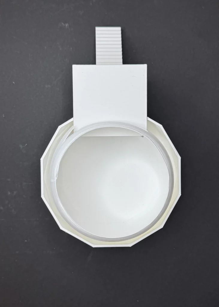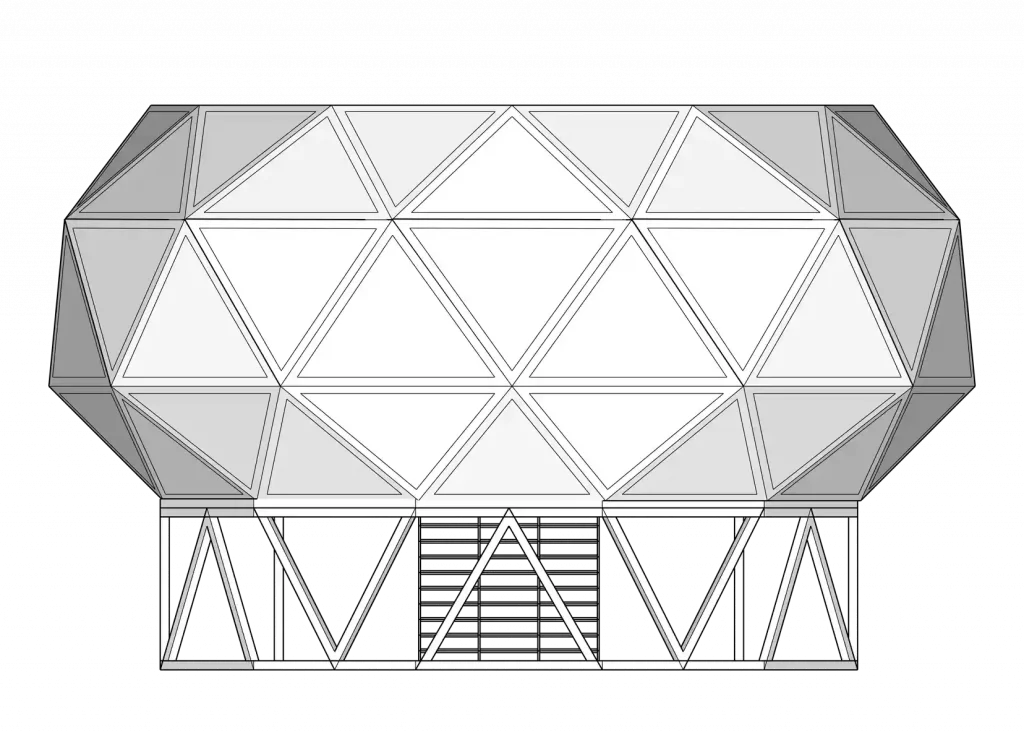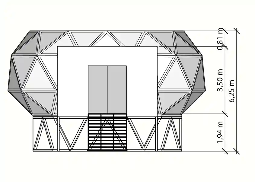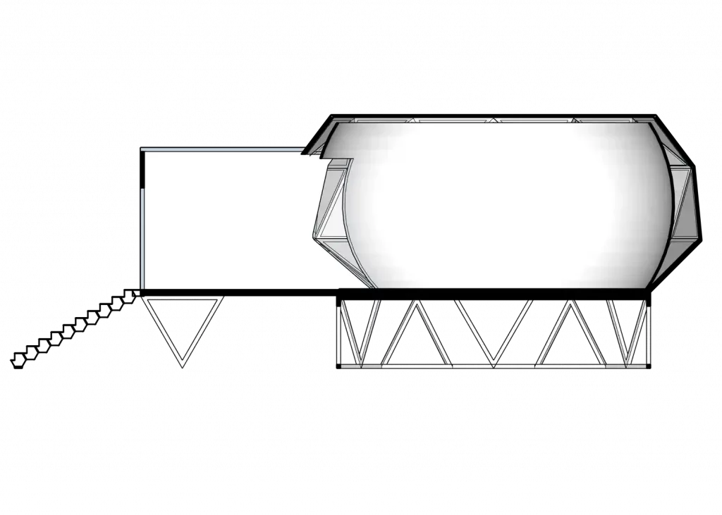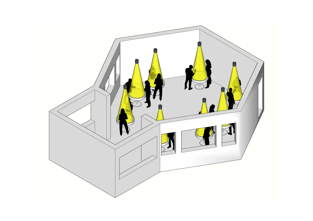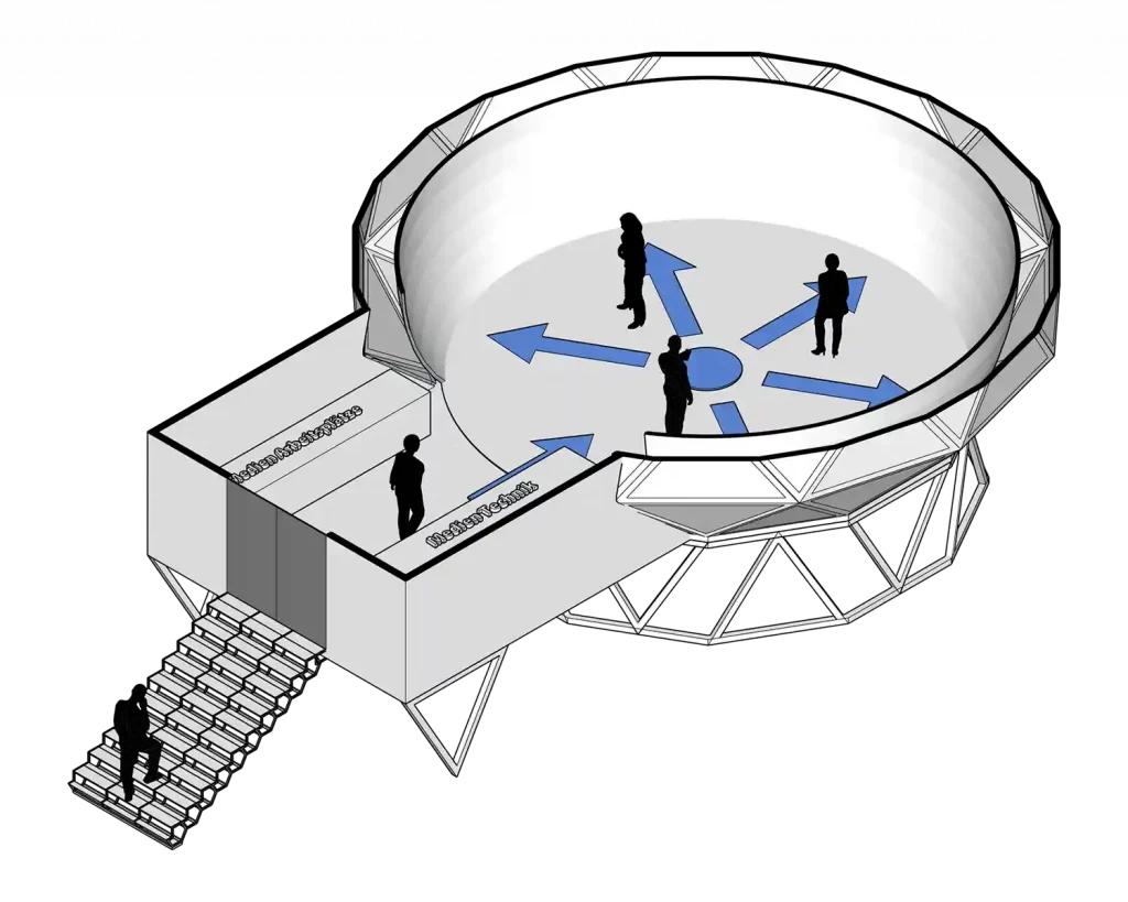 Das Innere des Labors präsentiert sich als substitutiver Raum für immersive Präsentationen. Die polygone Außenhülle ist innen mit einer sphärischen Panorama-Leinwand bespannt. Decke und Boden sind ebenfalls als Projektionsflächen einsetzbar. So bietet das Labor eine voll-immersive Kulisse für die Experimente der Schüler und Lehrer. Im Foyer sind parallel zu den Wänden die Medientechnik positioniert. Ihr gegenüber sind Arbeitsplätze für die Vor- und Ausarbeitungen der immersiven Projektarbeiten.