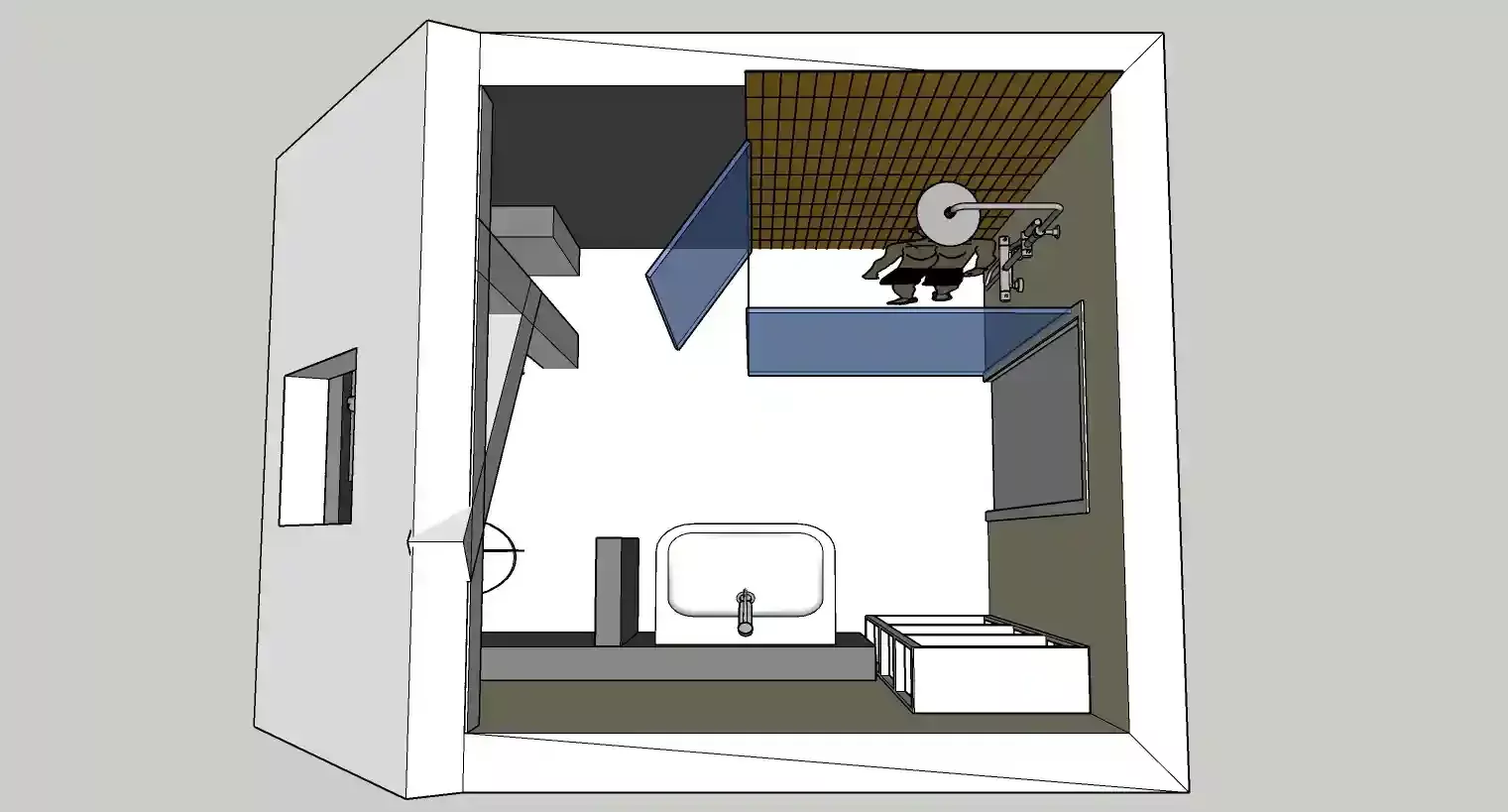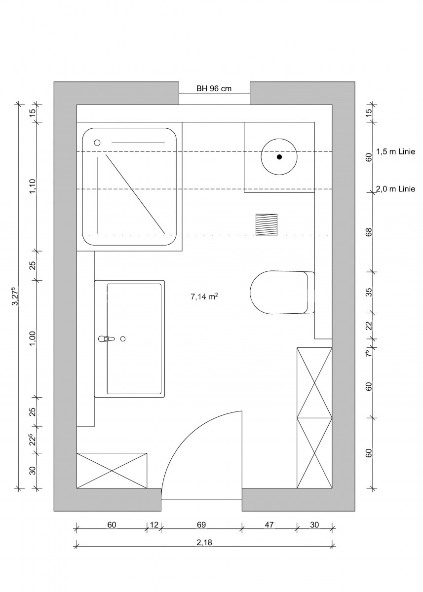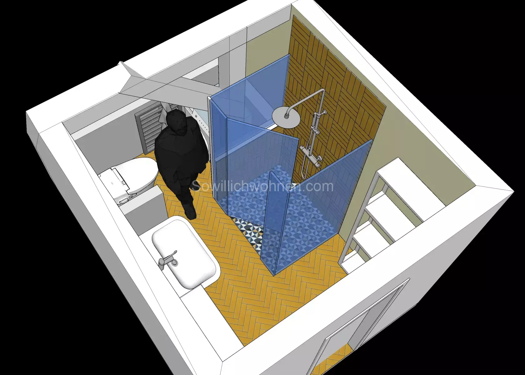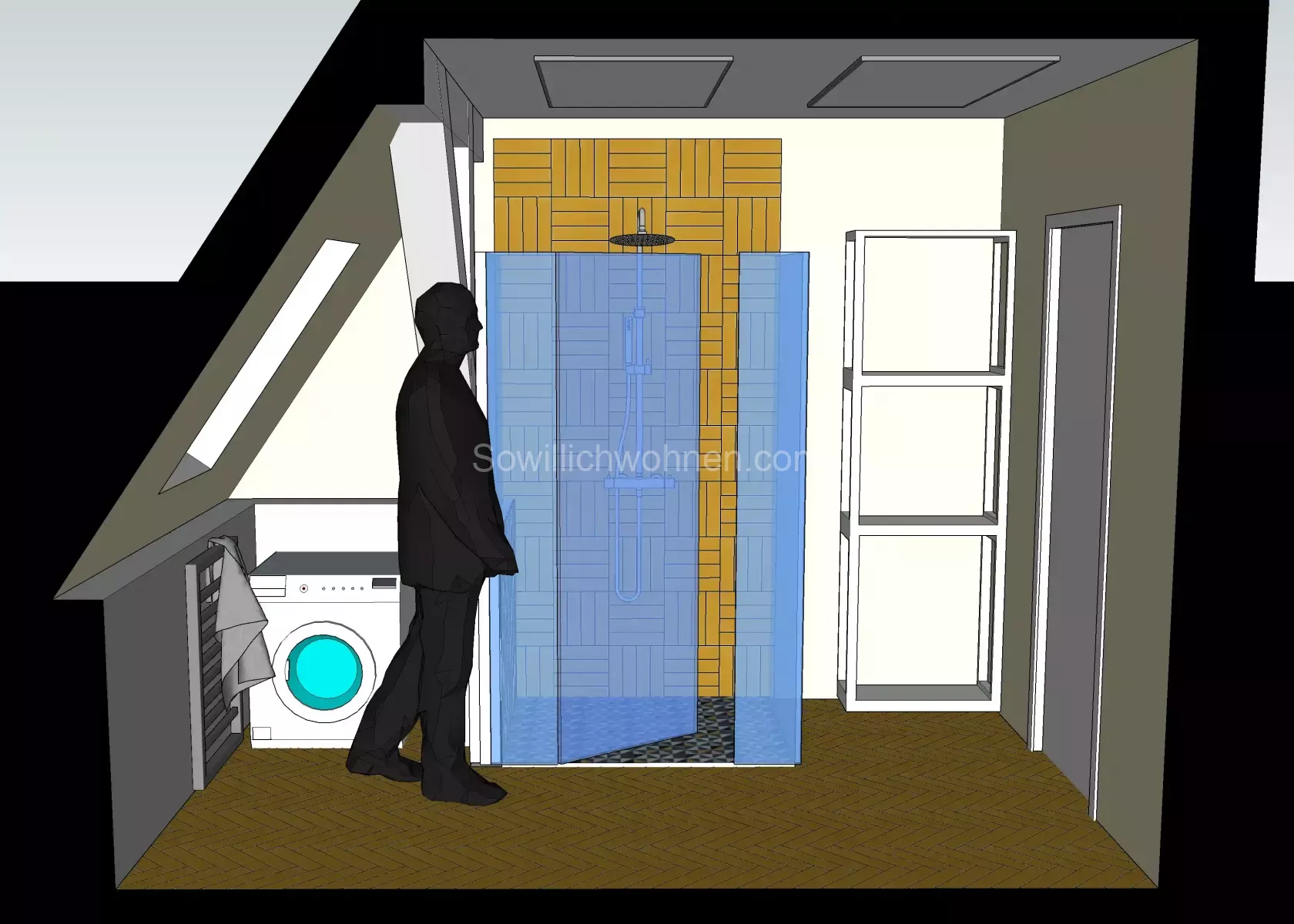 Das Bad im Dachgeschoss sollte erneuert werden. Die Bauherren äußerten den Wunsch, der Dusche mehr Platz zu geben. Bei der Größe des Bads eine Herausforderung, da weiterhin auch die Waschmaschine, die Toilette, ein Waschbecken und Stauraum zur Verfügung stehen soll. Mit einer Reihe von Entwürfen und Farbvorschlägen kam die Planung voran, bis zum vorläufigen Stopp aufgrund von umfangreicheren Renoverungsarbeiten am Dach des Hauses. Inzwischen sind die Modernisierungen am Dach ausgeführt und auch das Bad wurde schließlich erneuert.