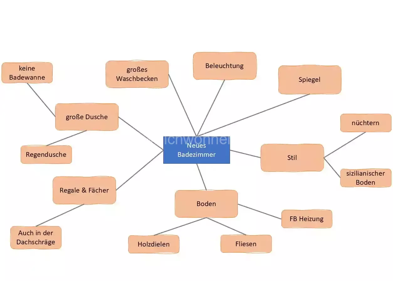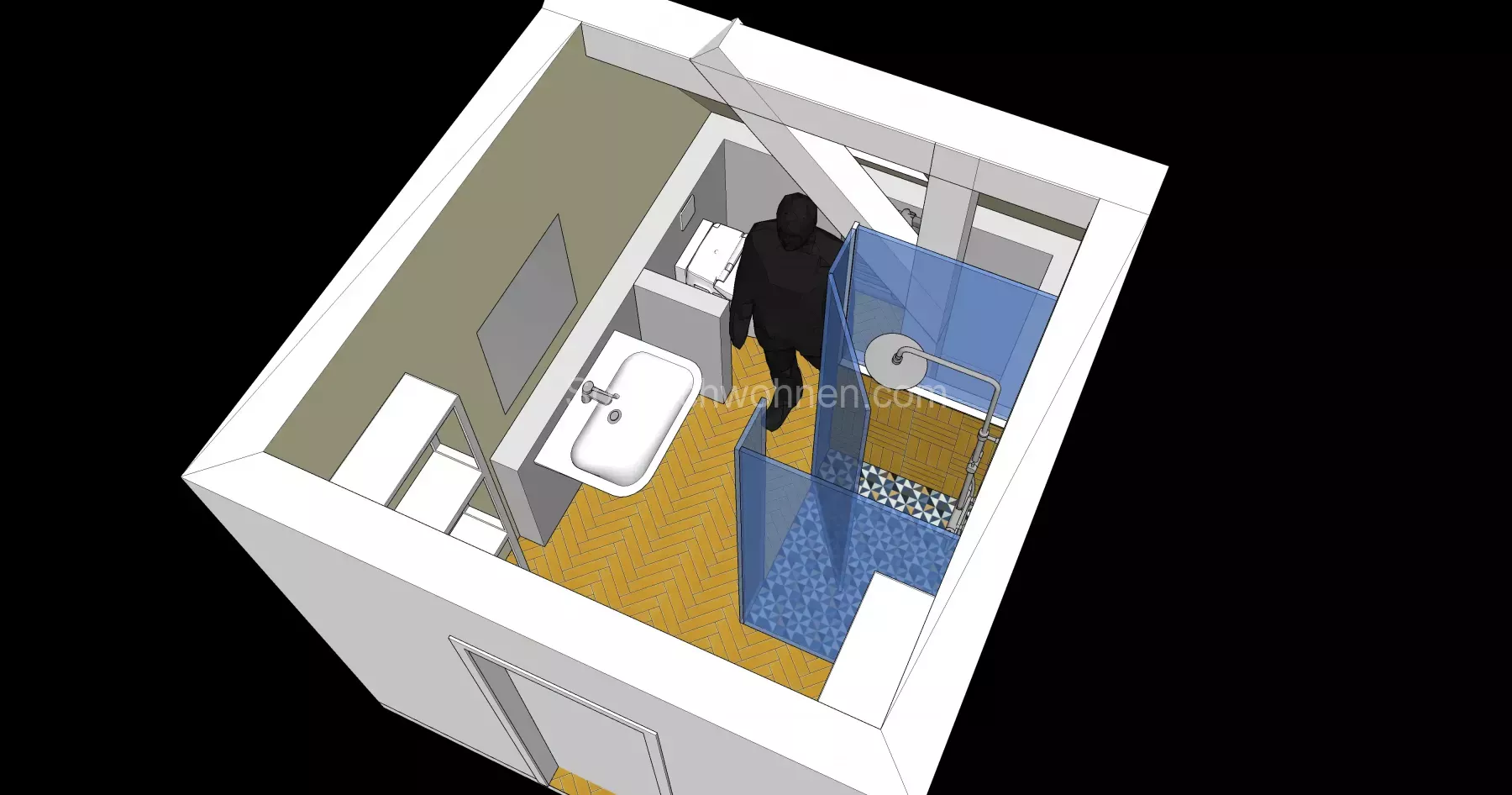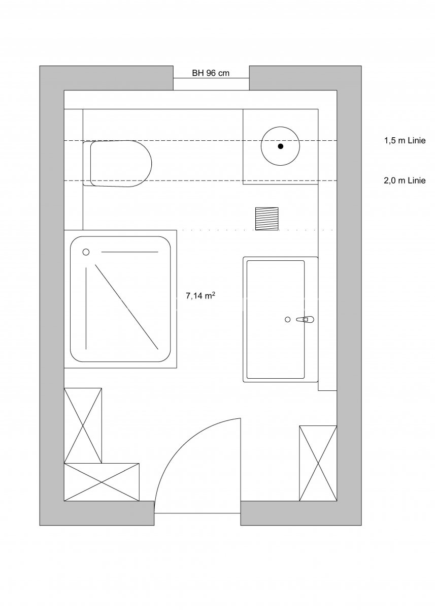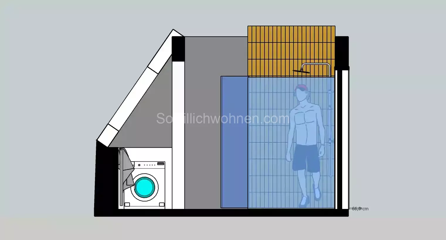 Das Bad im Dachgeschoss sollte erneuert werden. Die Bauherren äußerten den Wunsch, der Dusche mehr Platz zu geben. Bei der Größe des Bads eine Herausforderung, da weiterhin auch die Waschmaschine, die Toilette, ein Waschbecken und Stauraum zur Verfügung stehen soll. Mit einer Reihe von Entwürfen und Farbvorschlägen kam die Planung voran, bis zum vorläufigen Stopp aufgrund von umfangreicheren Renoverungsarbeiten am Dach des Hauses. Inzwischen sind die Modernisierungen am Dach ausgeführt und auch das Bad wurde schließlich erneuert.