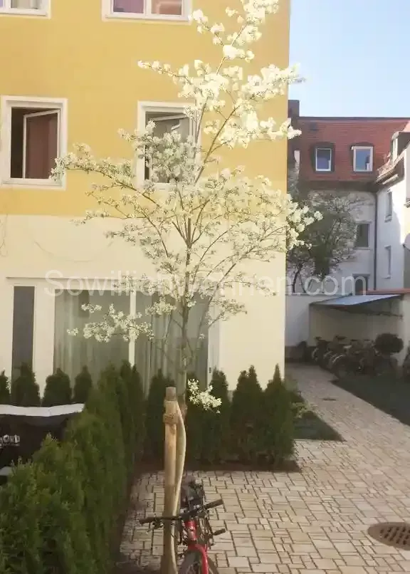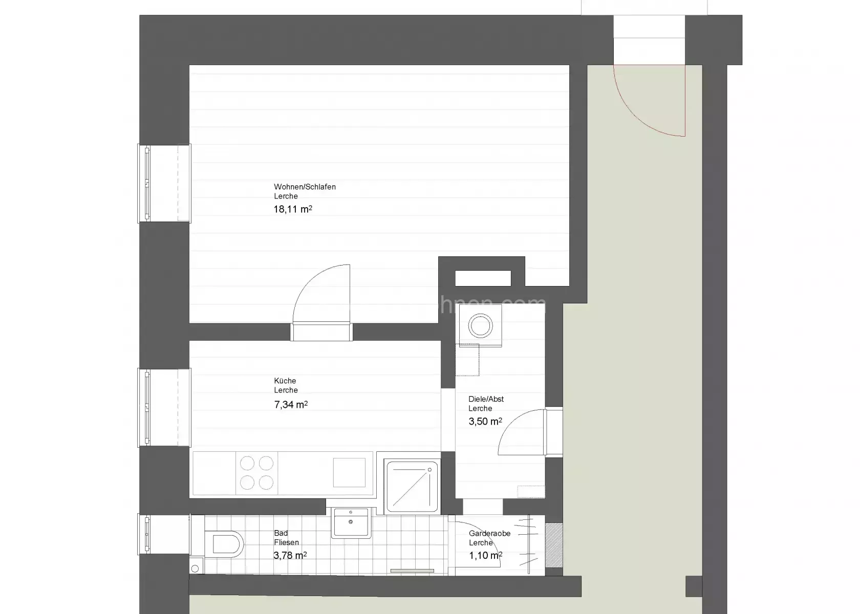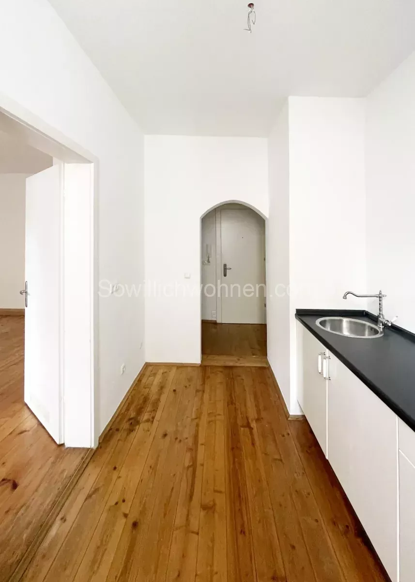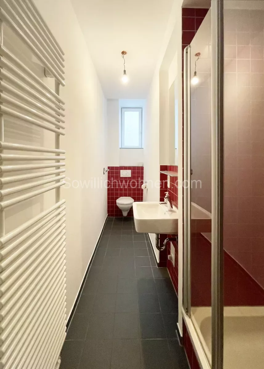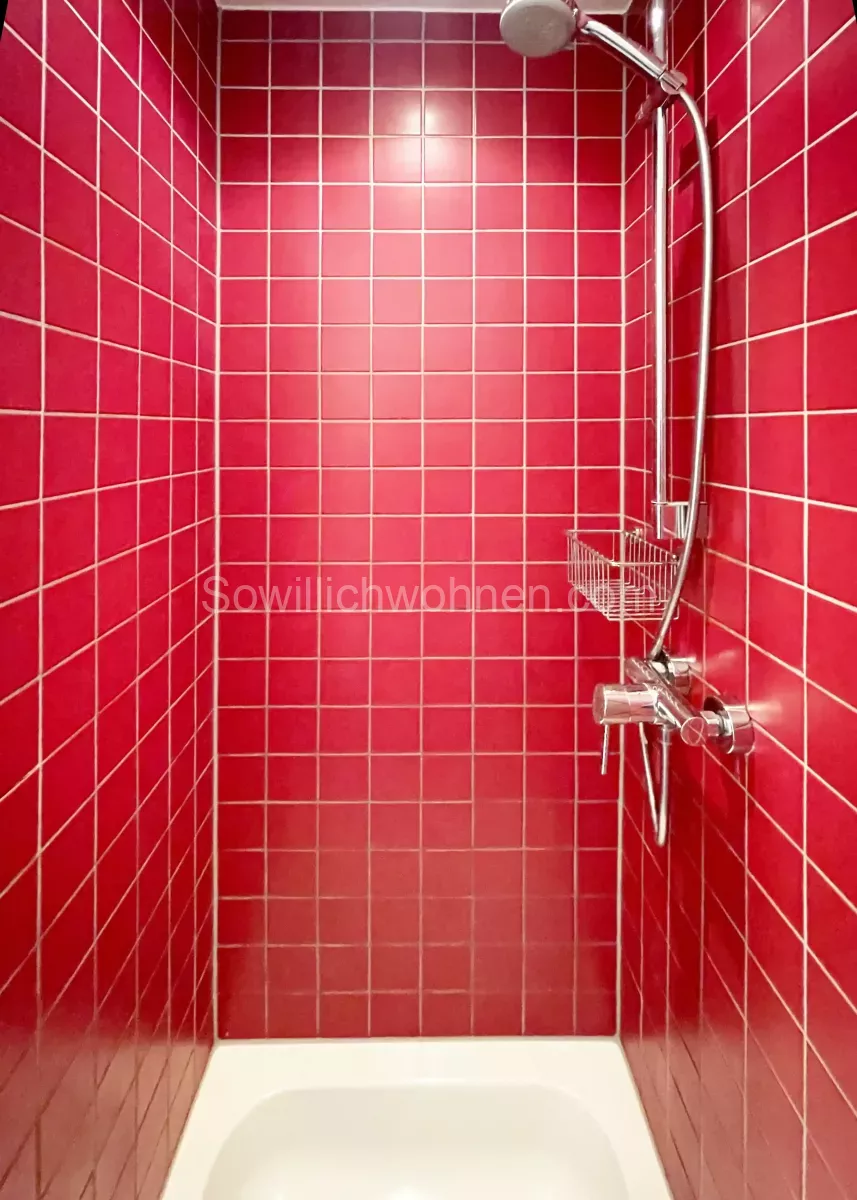 Die Ein-Zimmerwohnung im EG des Mehrfamilienhauses im Münchner Schlachthofviertel brauchte eine Auffrischung. Die Modernisierung inkl. des Badumbaus erfolgte bereits in 2012. Damals wurde das schmale Bad um eine Nische für die Dusche erweitert. In der angrenzenden Küche viel der Verlust dieser Nische nicht auf. Es war weiterhin ausreichend Platz für alle notwendigen Küchengeräte. Die Auffrischung galt im Wesentlichen den Wänden und den Böden. Die roten Fliesen im Bad sind weiterhin ein besonderer Akzent der Wohnung.