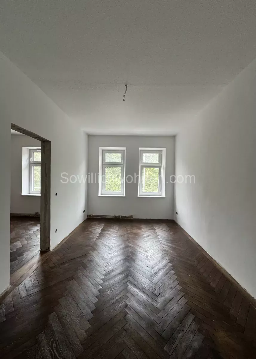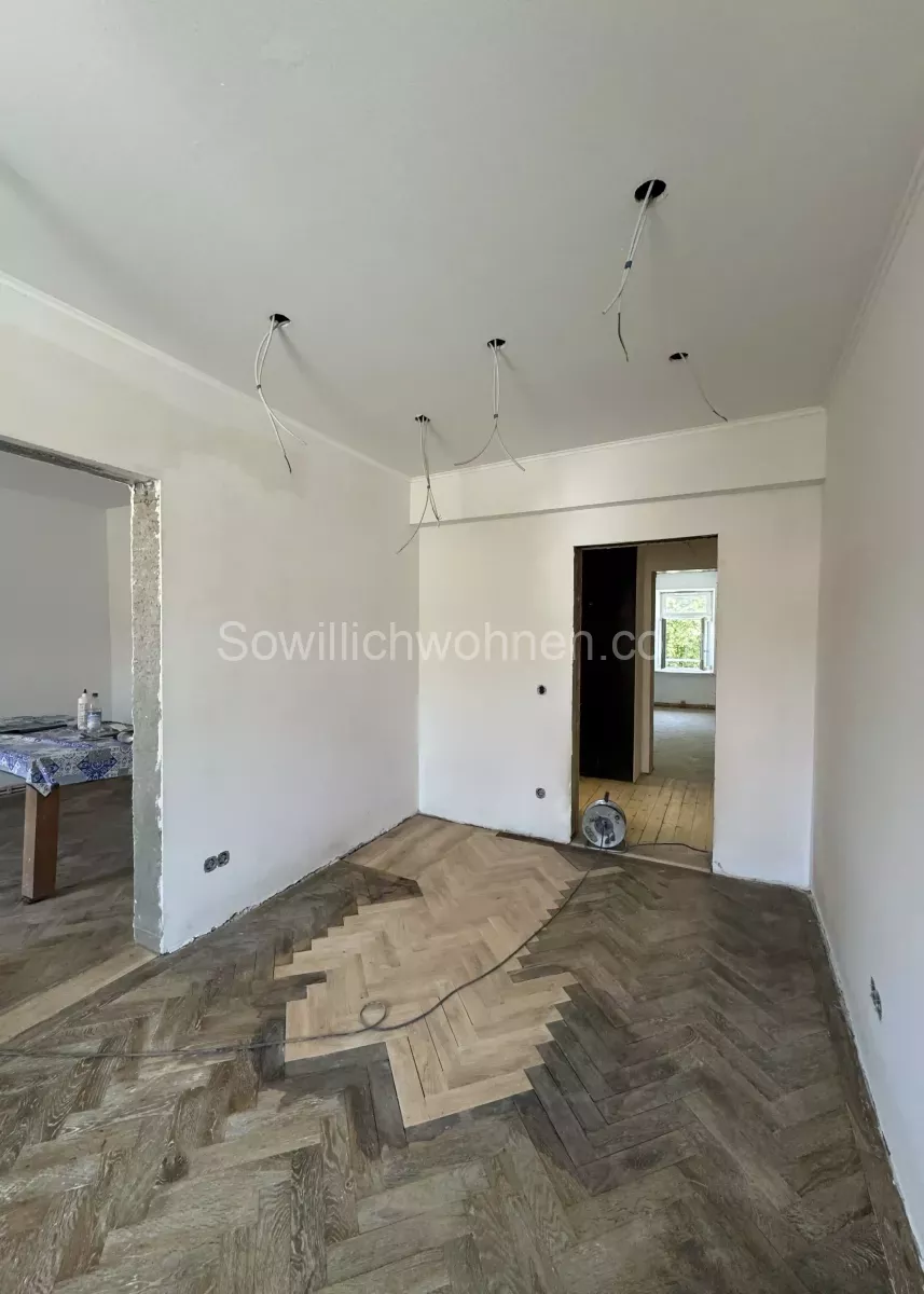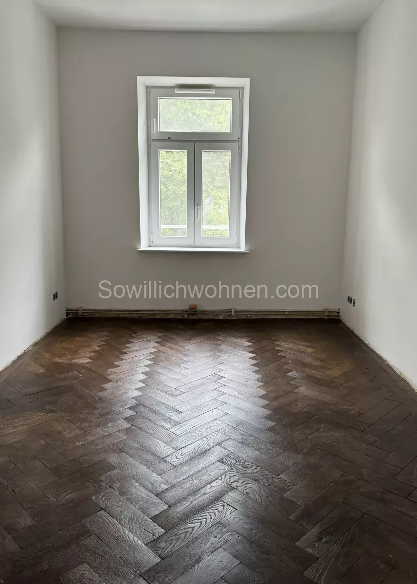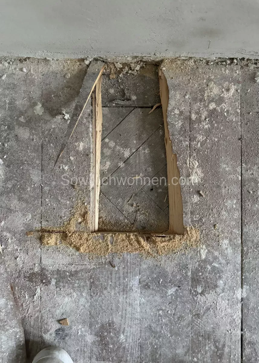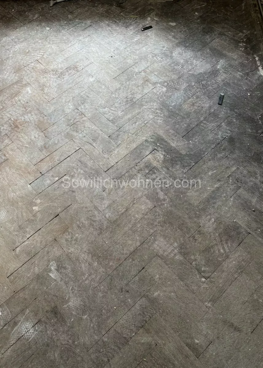 Die 4-Zimmerwohnung im Vorderhaus des Mehrfamilienhauses sollte eine Auffrischung erhalten. Neben der Erneuerung der Fenster, der elektrischen Installation und der Neuverputzung der Wände galt es, den Boden aufzufrischen. Unter eine Reihe von Bodenbelägen und Schüttungen kam ein altes Fischgrät-Parkett zum Vorschein. Das Besondere: Das Parkett war dunkelbrau behandelt und sollte auch in diesem Ton eine Auffrischung erhalten.