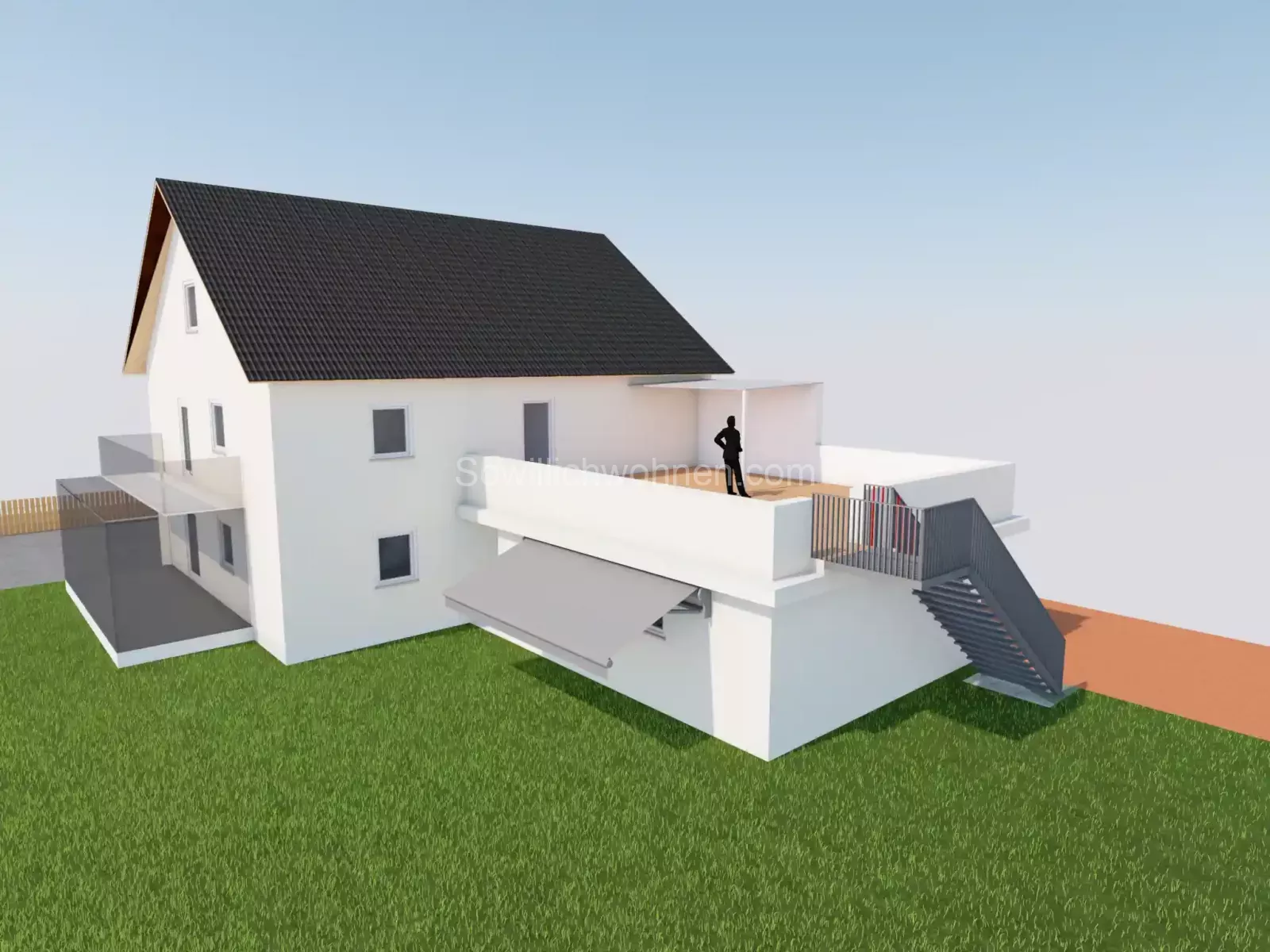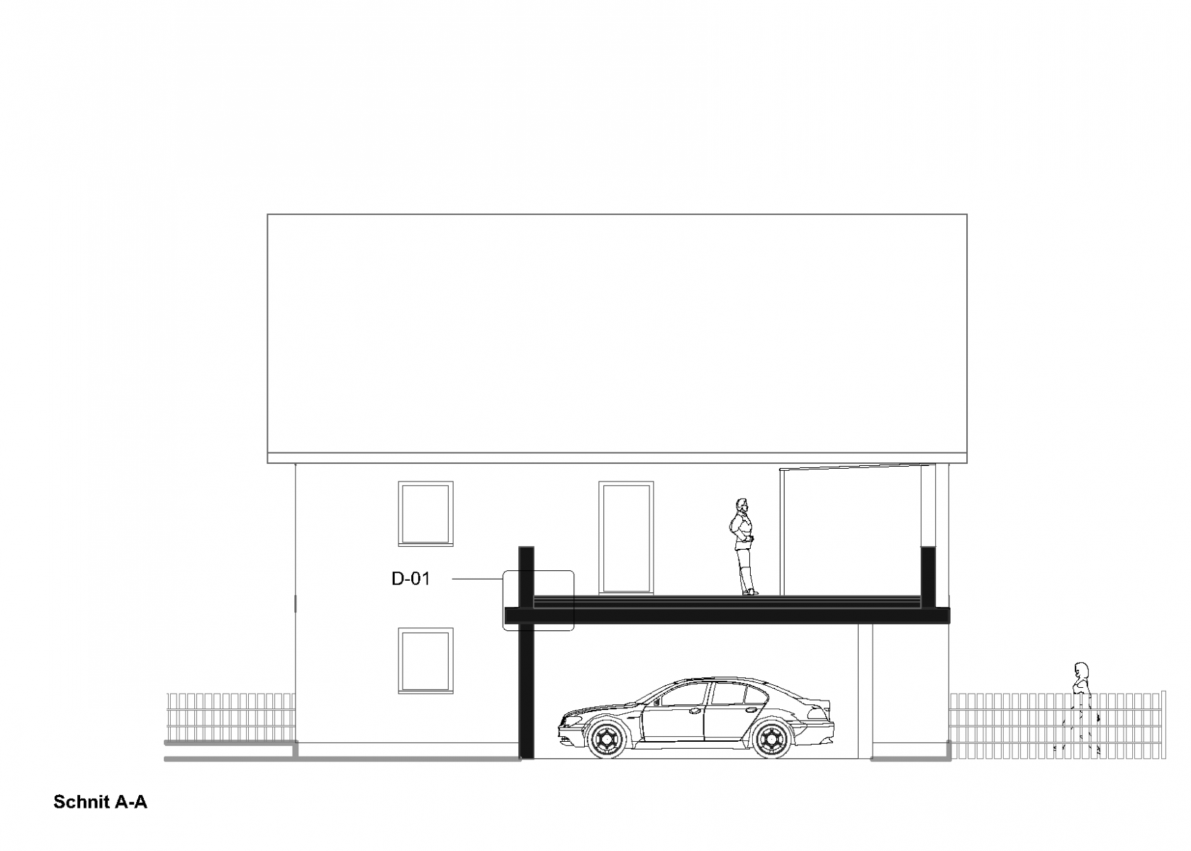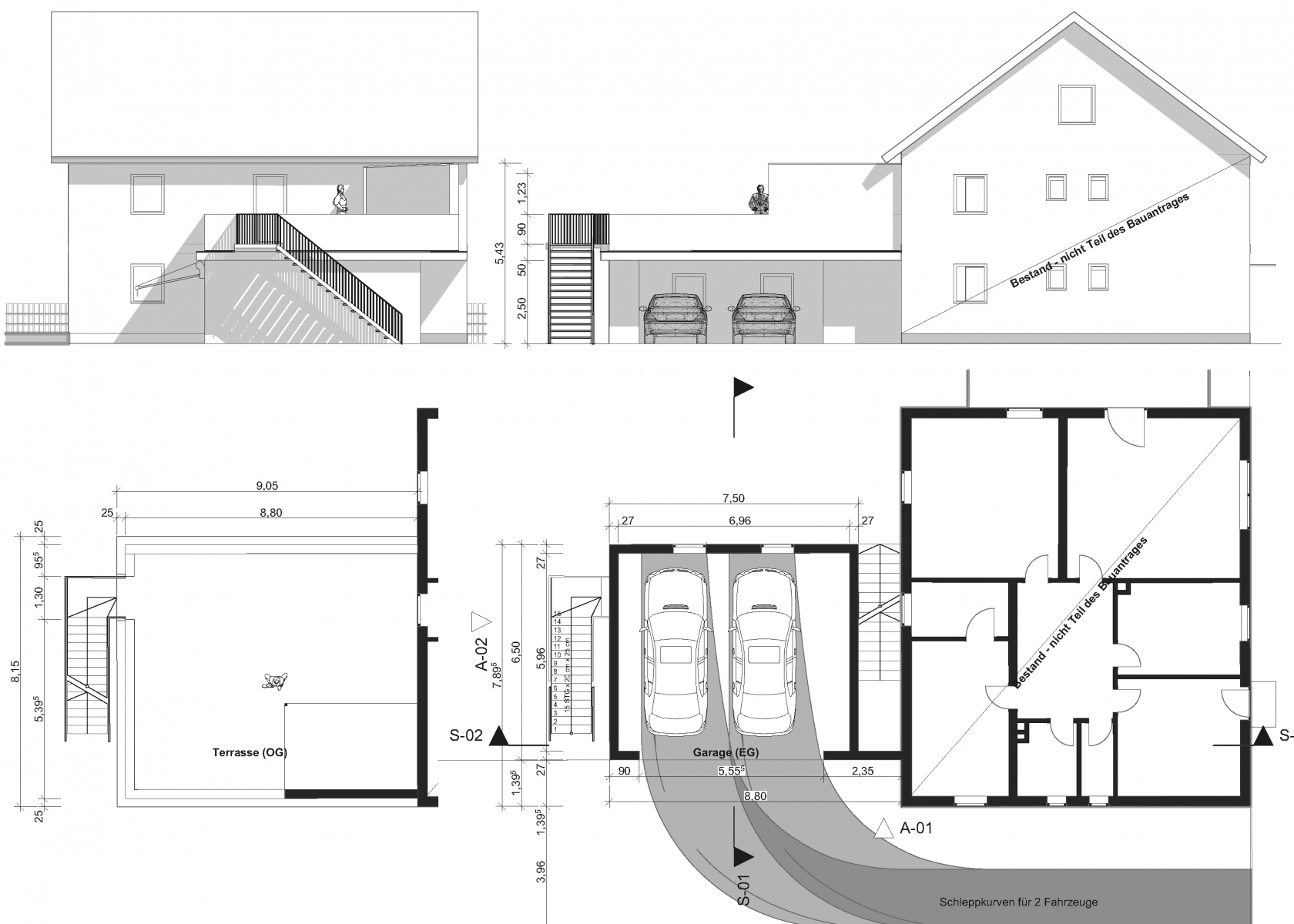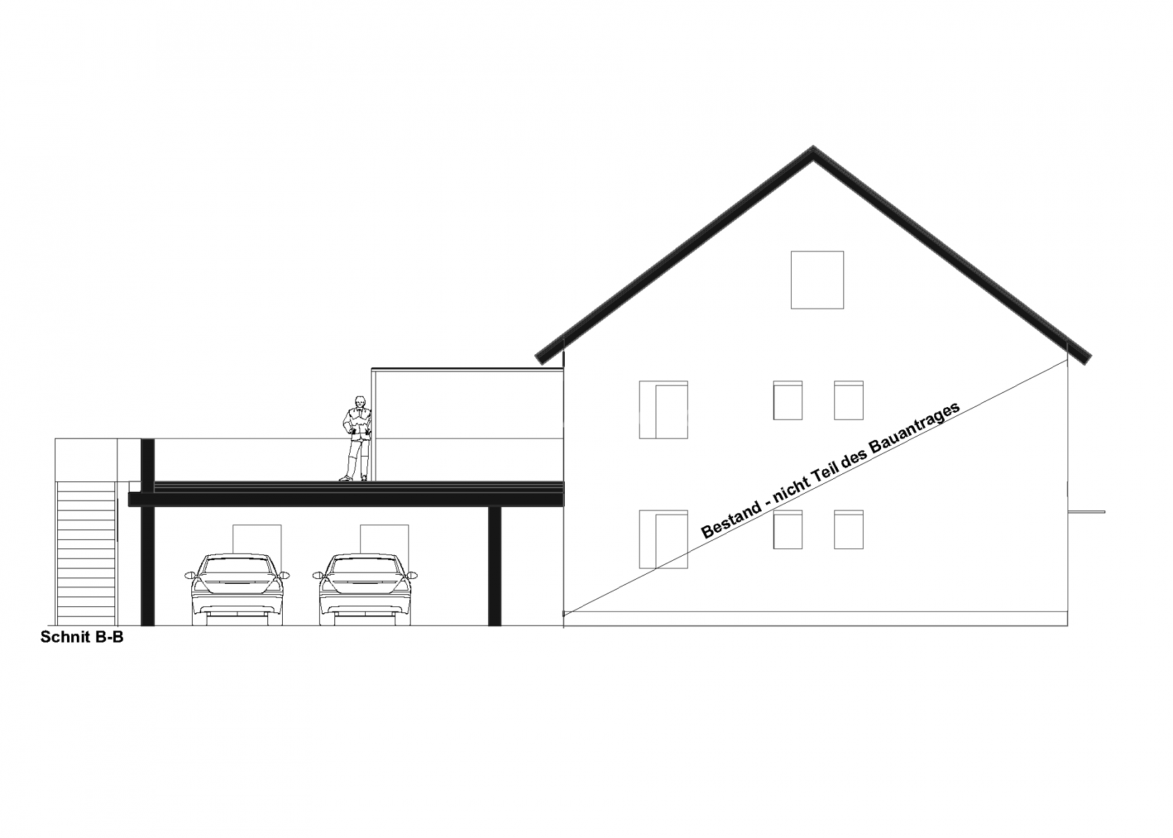 Der Bauherr wünscht sich eine neue, größere Garage mit einer Dachterrasse, die direkten Anschluss zur Wohnung im Obergeschoss des Mehrfamilienhauses hat. Für den Bauherrn wurden die Entwürfe erstellt und die Eingabeplanung vorbereitet. Die Realisierung des Bauvorhabens sollte ein Generalunternehmer übernehmen.