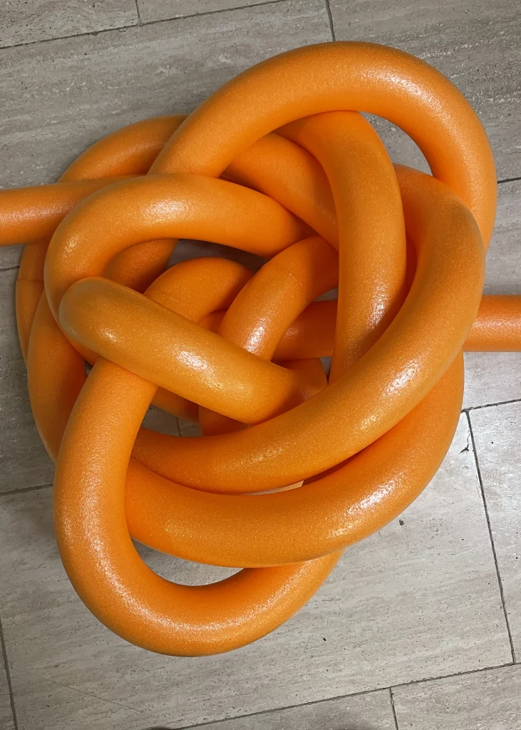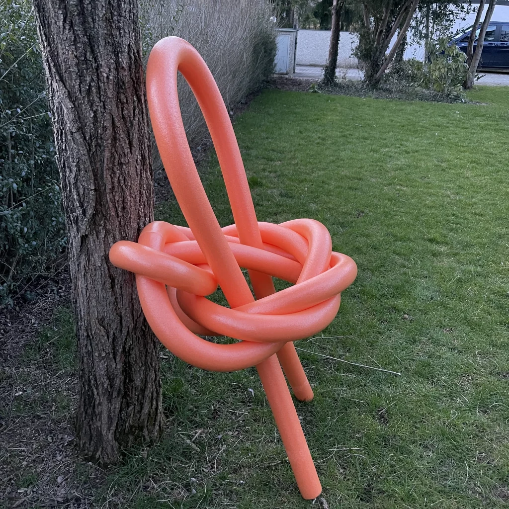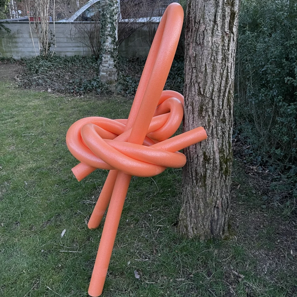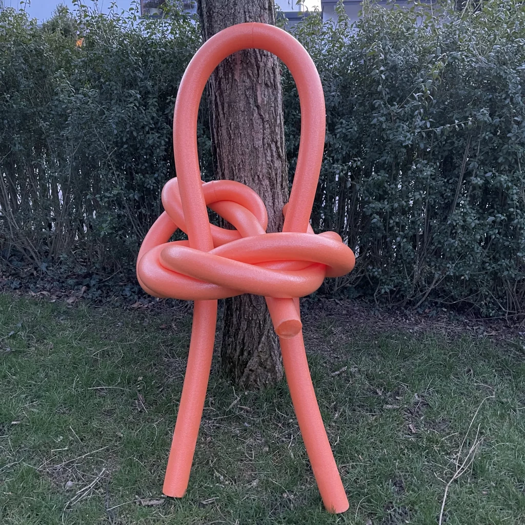 Die Basis für diese Stuhlkonstruktion ist eine ca. 10 m lange „Schwimmnudel“. Im Sitzbereich bildet ein Knotengeflecht die Sitzfläche und ein einfachen Bogen, welcher durch das Geflecht gezogen wird vollendet die Studie des Sitzmöbels a la Thonet Kaffeehausstuhl