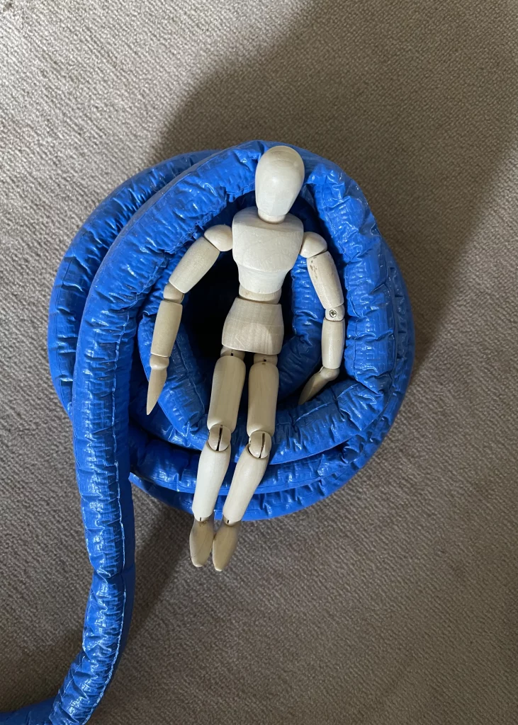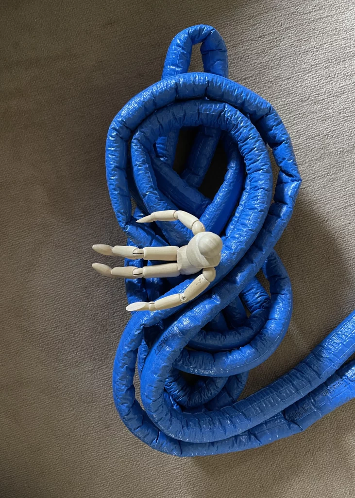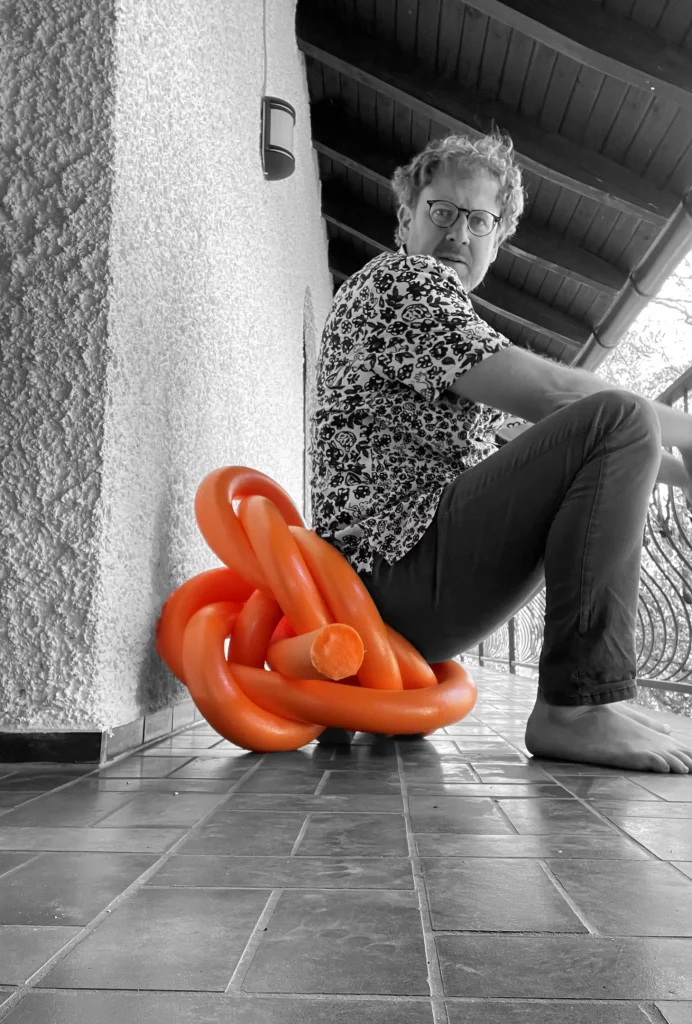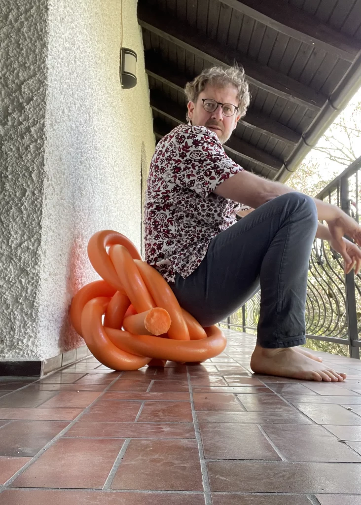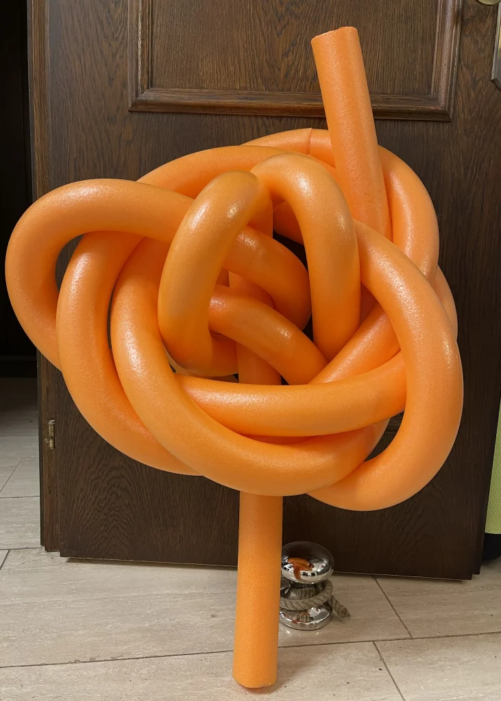 Die Basis für diese Stuhlkonstruktion ist eine ca. 10 m lange „Schwimmnudel“. Im Sitzbereich bildet ein Knotengeflecht die Sitzfläche und ein einfachen Bogen, welcher durch das Geflecht gezogen wird vollendet die Studie des Sitzmöbels a la Thonet Kaffeehausstuhl