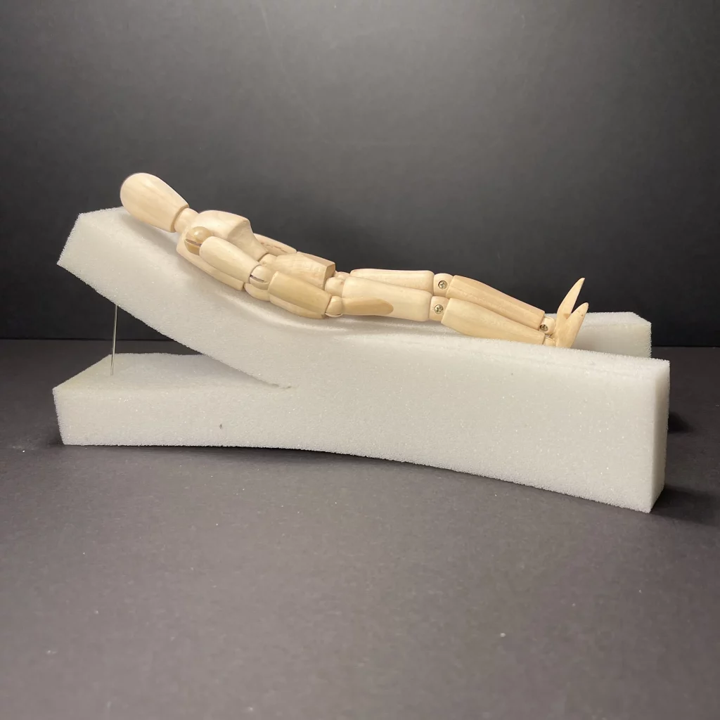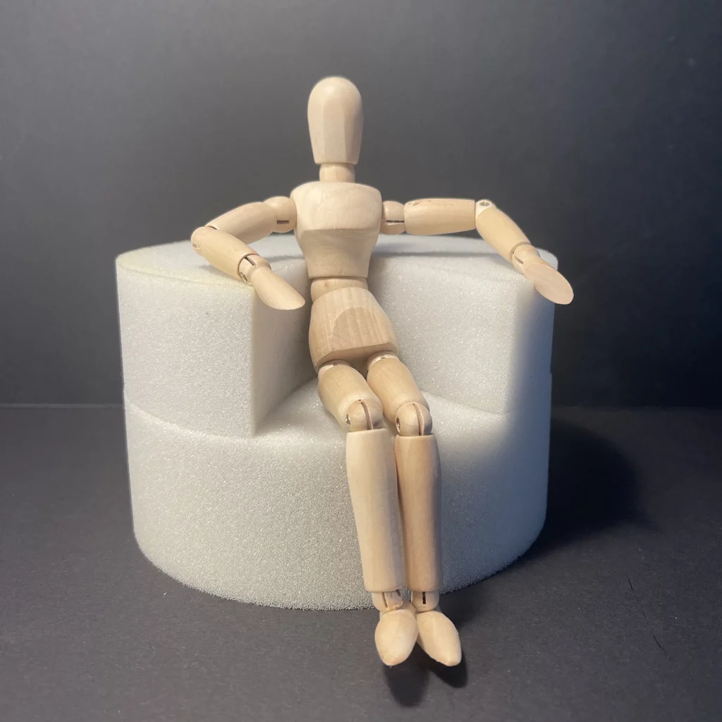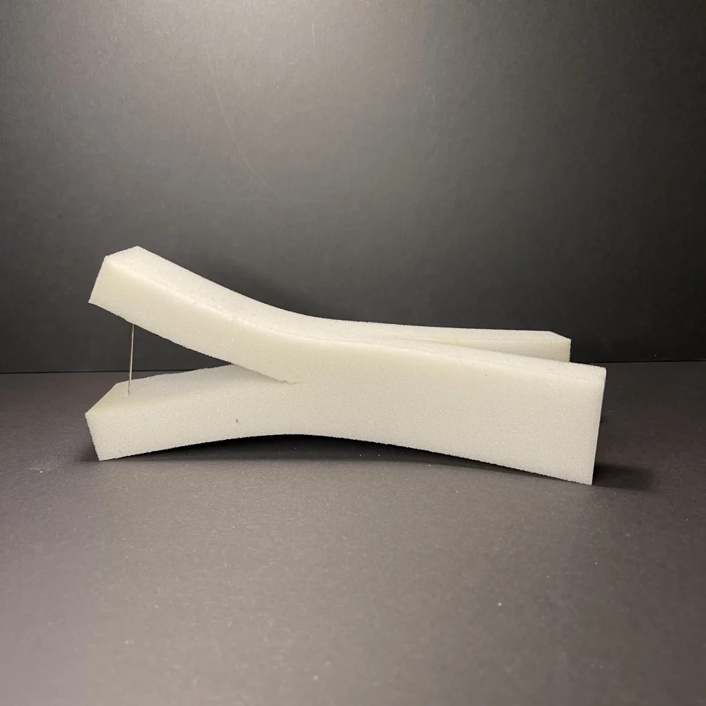 Ein Schaumstoffblock wird mittig gefaltet und mit einer Tackerklammer fixiert. Der elastische Widerstand des Materials, welcher durch die Klammer in die Form gezwungenen wurde, lässt rückseitig einen Knick entstehen, der aufgestellt, die Form eines Sitzmöbels für das Auge entstehen lässt, welches zum gemütlichen sitzen mit gewinkelter Rücklehne einlädt.