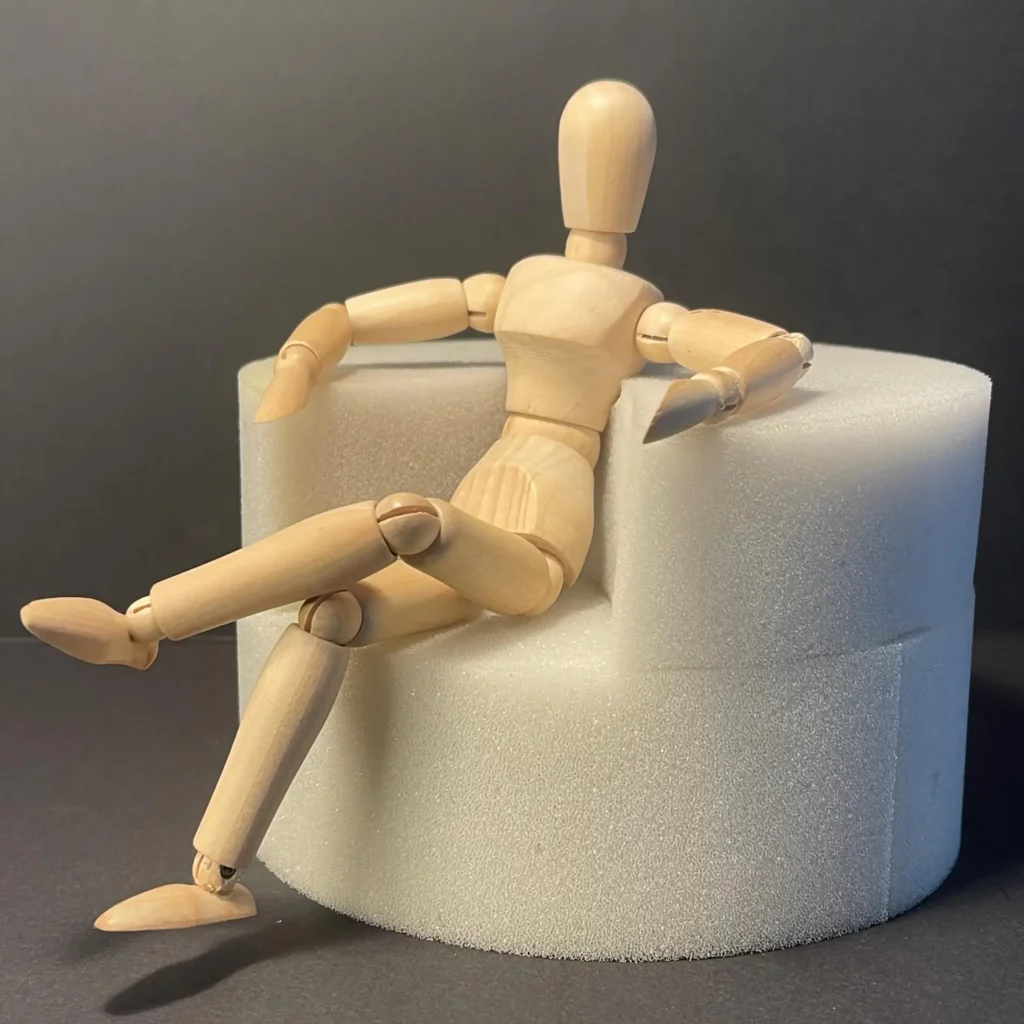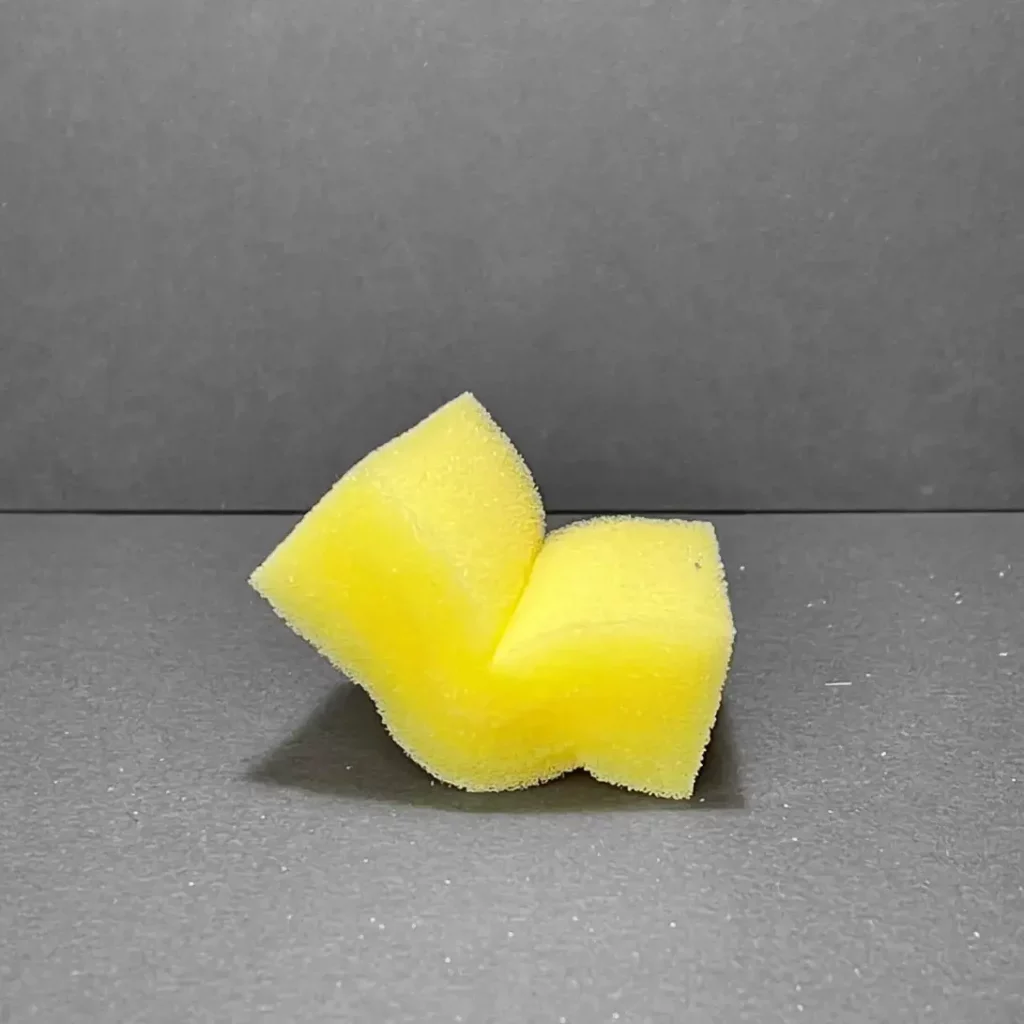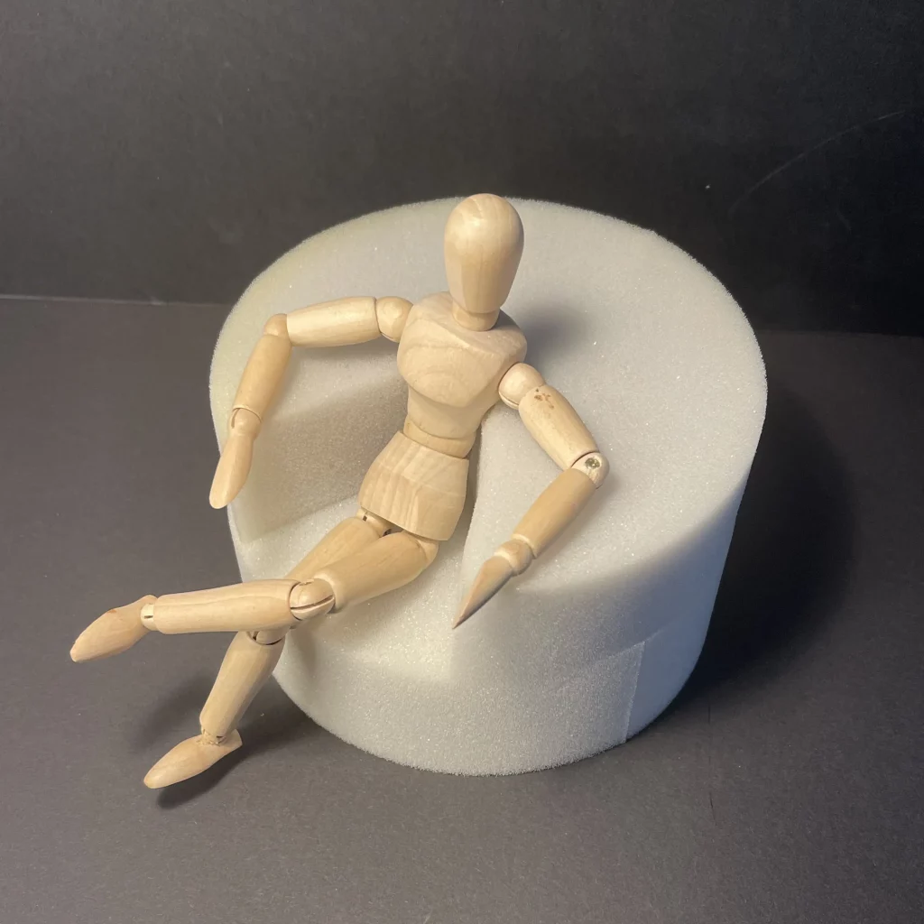 Ein Schaumstoffblock wird mittig gefaltet und mit einer Tackerklammer fixiert. Der elastische Widerstand des Materials, welcher durch die Klammer in die Form gezwungenen wurde, lässt rückseitig einen Knick entstehen, der aufgestellt, die Form eines Sitzmöbels für das Auge entstehen lässt, welches zum gemütlichen sitzen mit gewinkelter Rücklehne einlädt.