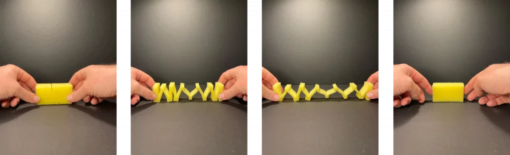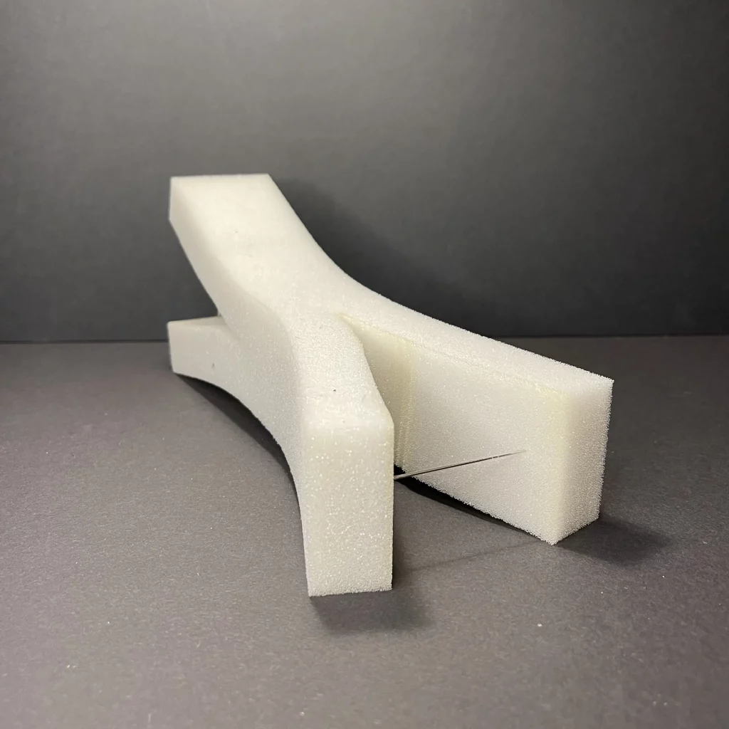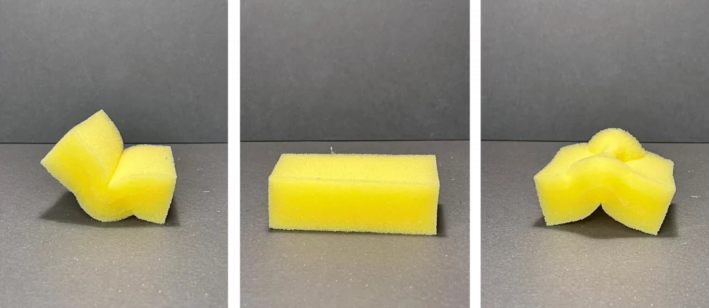 Ein Schaumstoffblock wird gegenüberliegend im Versatz ca. 4/5 tief eingeschnitten. Die „Ziehharmonika“ lässt sich auseinanderziehen. Es entsteht eine Reihung von abgegrenzten Feldern, die am Boden einen soliden Stand finden und in den Zwischenräumen eine Idee für einen Sitzplatz – ohne Lehne suggerieren.