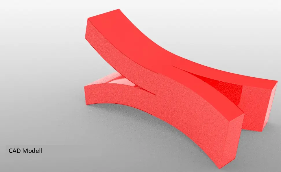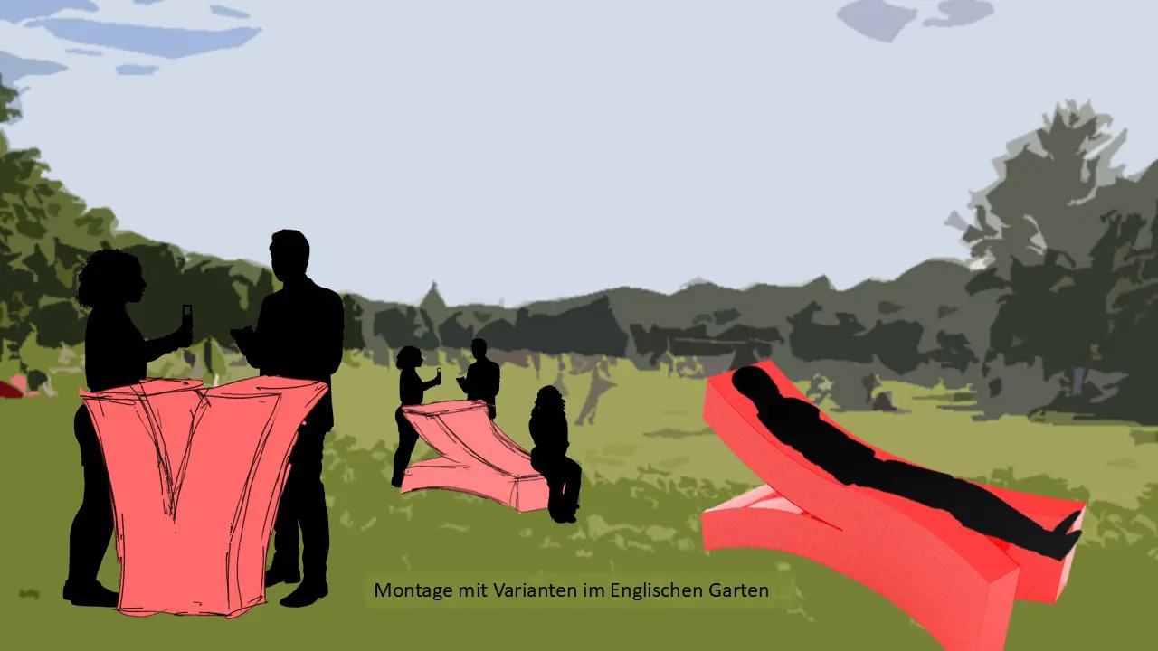 Die Spreizung der gewinkelten Enden ist hier noch mit einem Stab hergestellt und fixiert. Im Maßstab 1:1 kann diese Aufgabe eine innenliegende Konstruktion aus Metallstäben übernehmen. Als Material für die Oberfläche ist ein Polyurethan-Kunststoff denkbar. Dieser bietet die Vorteile einer gewissen Elastizität, welche für eine höhere Bequemlichkeit sorgt.