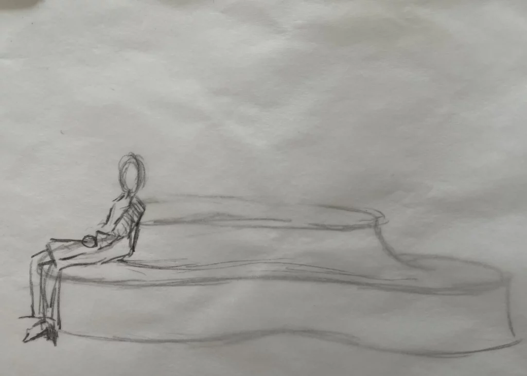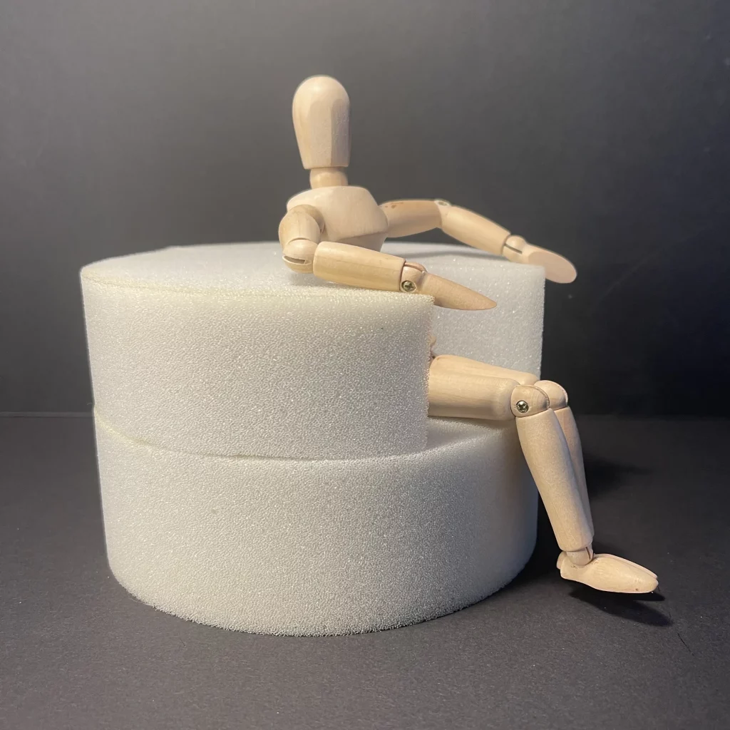 Zwei breite Schaumstoffzylinder-Elemente liegen übereinander und bilden die Basis dieser Sitzmöbelstudie. Das obere Element wird um ca. 1/3 ausgeschnitten. Die ebene Oberfläche ist eine ideale Ablage für die Arme in einer bequem angelehnten Sitzposition