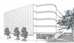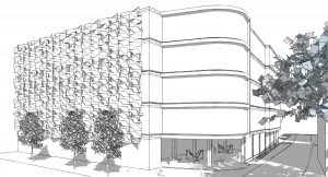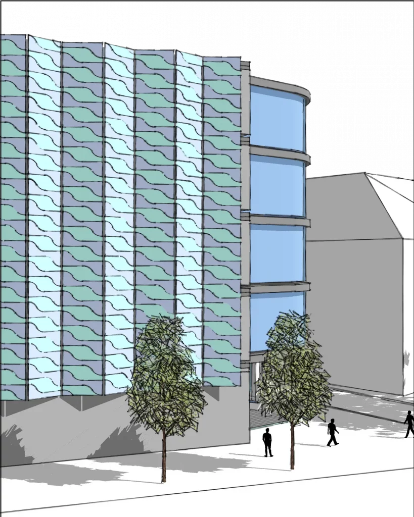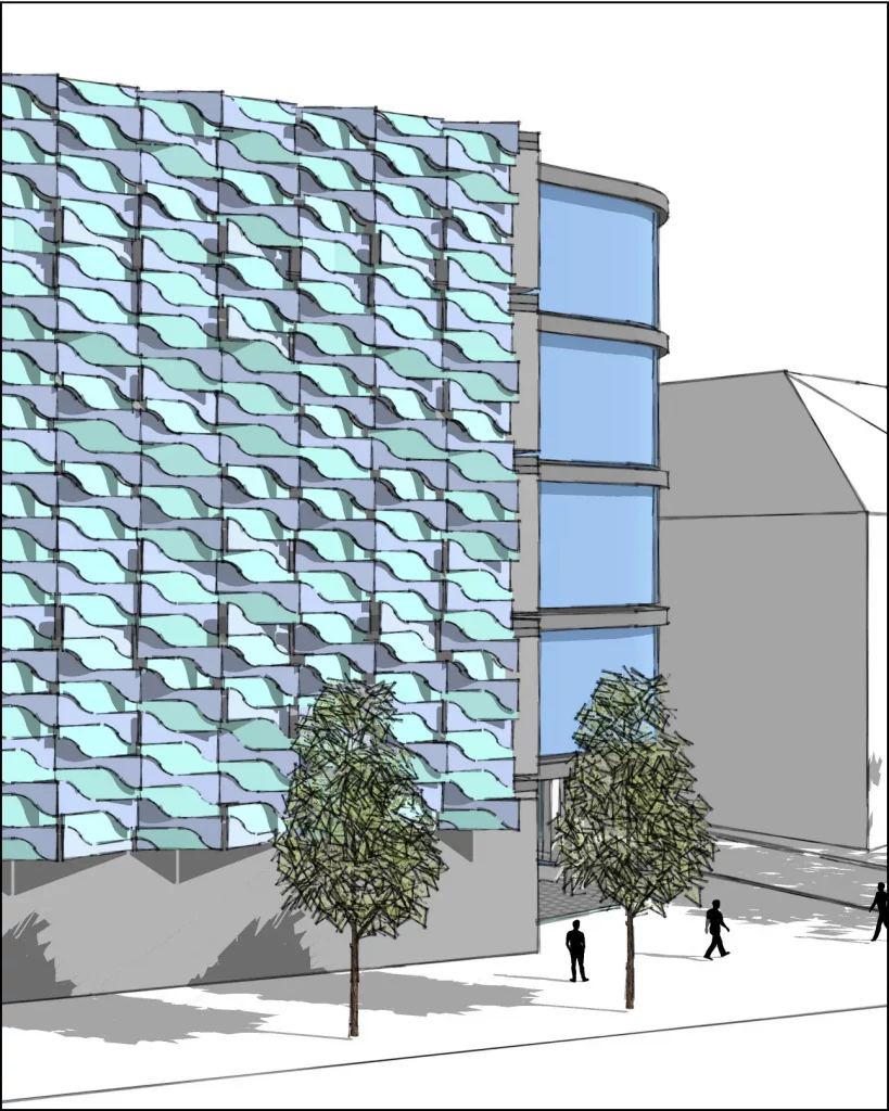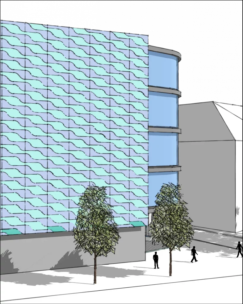 Die große Südwand des Breuninger Gebäudes ist für die Montage der Wellenwand gute geeignet. Die einzelnen Elemente sind 50 cm von der Wand entfernt montiert und können sich über eine vertikale Achse in einem Winkel von +/-20° drehen.