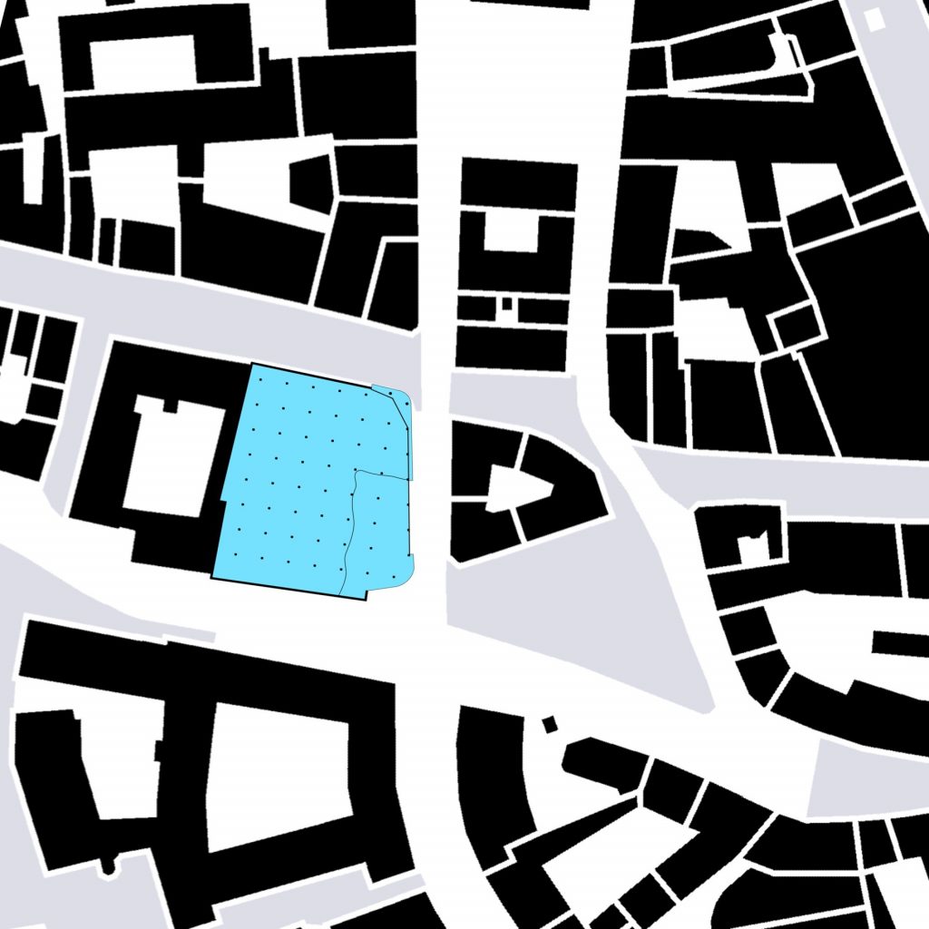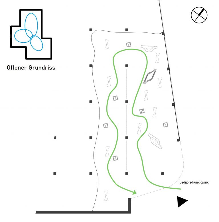 Der Ausstellungseingang ist an der ca. 14 m breiten abgerundeten Ost-Ecke des Gebäudes, gegenüber vom Rindermarkt gelegen.