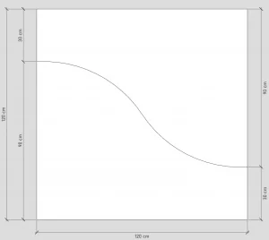 Die Grundform der „Curve“ Welle skaliere ich für die Fassadengestaltung auf eine Seitenlänge von 120cm. Die rechtwinkligen Seitenlängen betragen 90 und 30 cm. Geschlossen wird die Form durch den Wellenverlauf einer Sinuskurve welcher die unterschiedlich hohen Seiten verbindet. Das Quadrat ergibt sich durch die Addition einer um 180° gedrehten 2. Grundform der Welle.