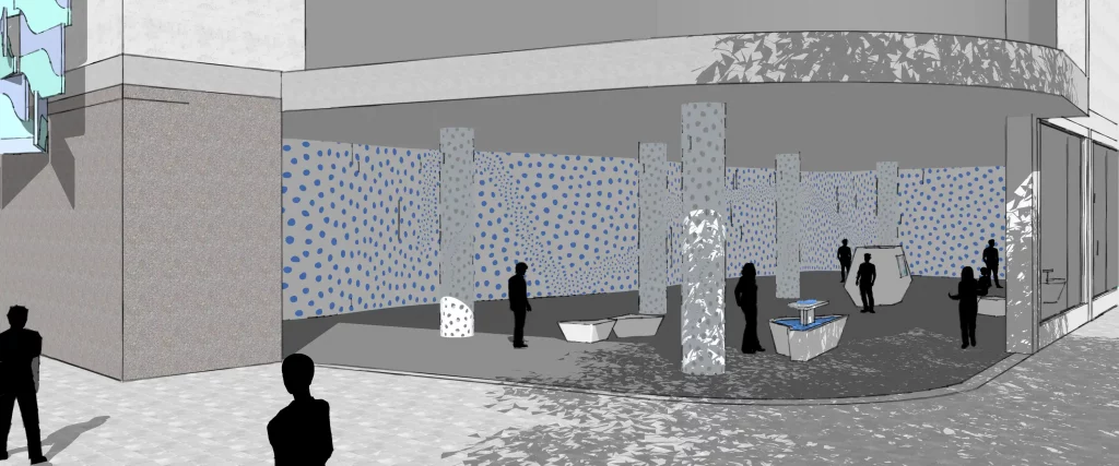 Ziel ist es, mit Hilfe einer auffälligen Fassade Aufmerksamkeit zu schaffen und durch die visuelle Gestaltung der Innenräume, die Neugier der Passanten zu wecken, der Wasserausstellung einen Besuch abzustatten.