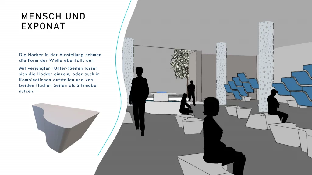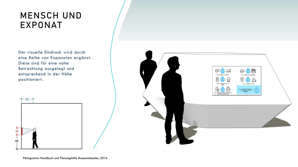 Mit der inhaltlichen Ausgestaltung der Wasserausstellung verfolge ich die Absicht, den Besucher / die Besucherin in der (kurzen) Zeit des Aufenthalts emotional zu erreichen und einen Anker der Erkenntnis und der Erinnerung über den eigenen Umgang mit Wasser zu setzen.