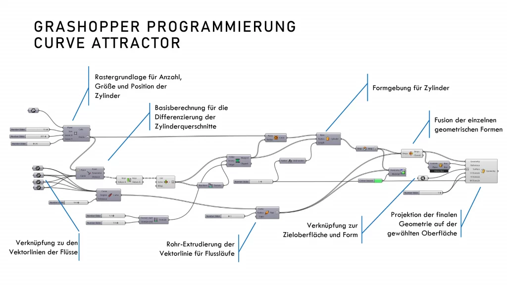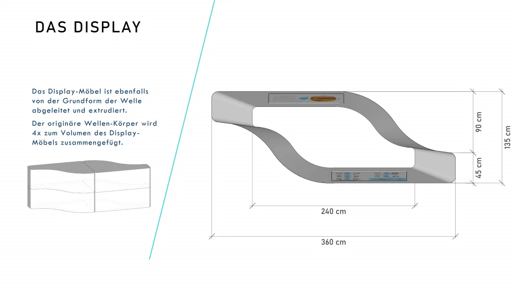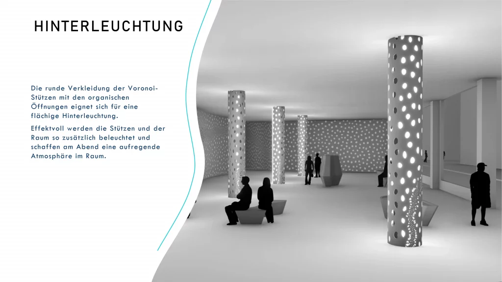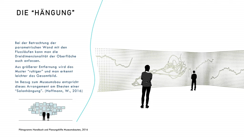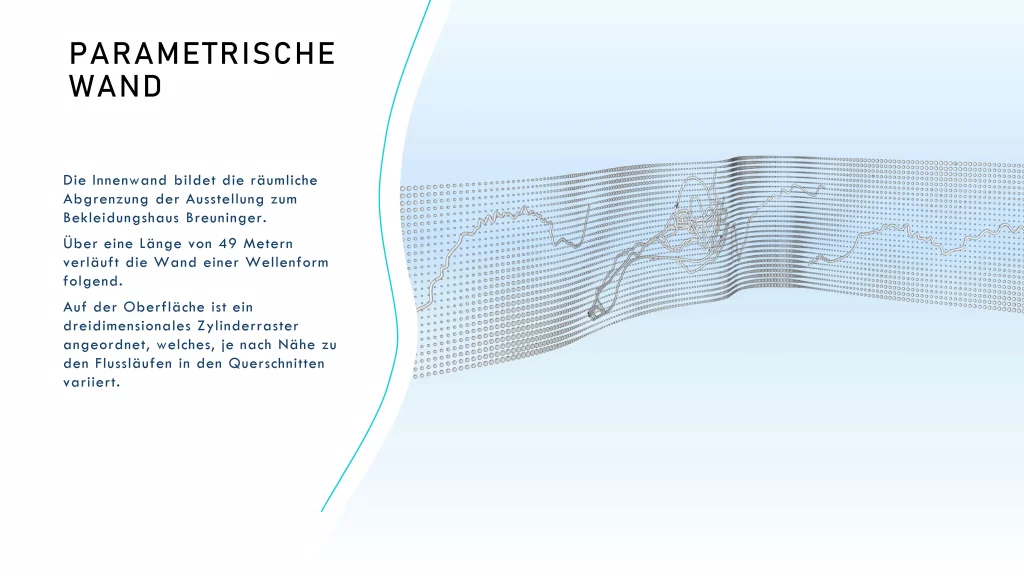 Den visuellen Kick und emotionalen Magneten zum Besuch der Ausstellungsräume bilden die parametrischen Verkleidungen und Wandgestaltungen, welche sich über die vertikalen Innenflächen erstreckt. Auf dieser werden im Großformat die Flussläufe dreier Alpenflüsse Bayerns dargestellt (Inn, Isar, Lech). Mit der Software Grashopper programmiere ich die gestalterische Visualisierung der Flussläufe.