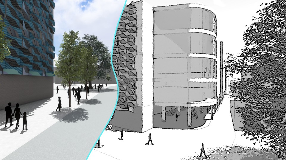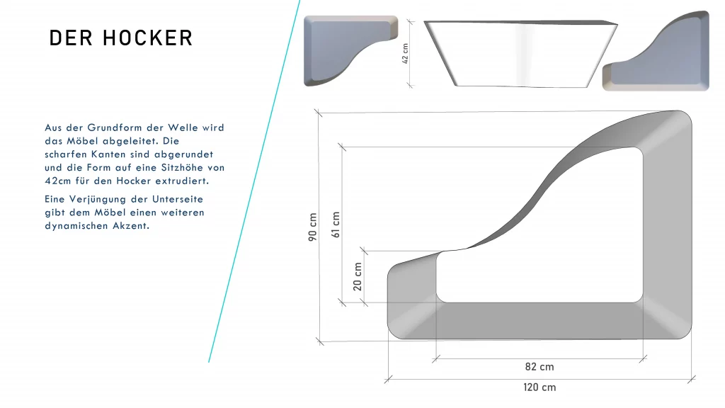 Die Grundform der „Curve“ Welle skaliere ich für die Fassadengestaltung auf eine Seitenlänge von 120cm. Die rechtwinkligen Seitenlängen betragen 90 und 30 cm. Geschlossen wird die Form durch den Wellenverlauf einer Sinuskurve welcher die unterschiedlich hohen Seiten verbindet. Das Quadrat ergibt sich durch die Addition einer um 180° gedrehten 2. Grundform der Welle.