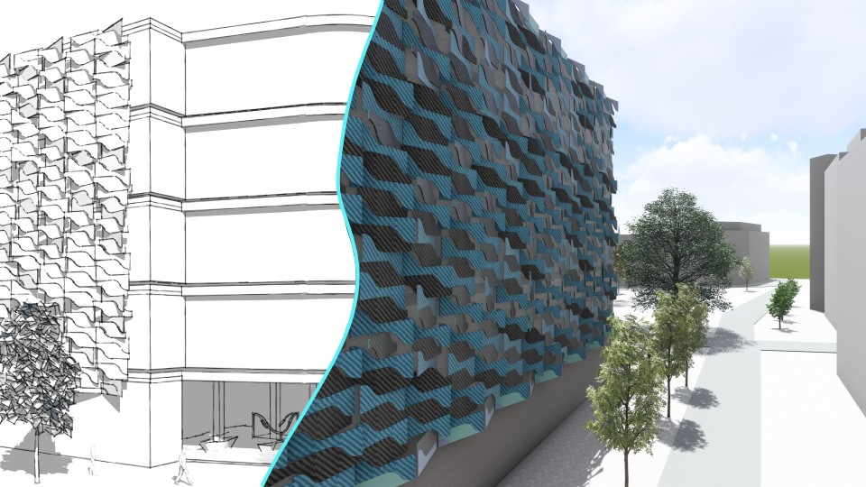 Die große Südwand des Breuninger Gebäudes ist für die Montage der Wellenwand gute geeignet. Die einzelnen Elemente sind 50 cm von der Wand entfernt montiert und können sich über eine vertikale Achse in einem Winkel von +/-20° drehen.