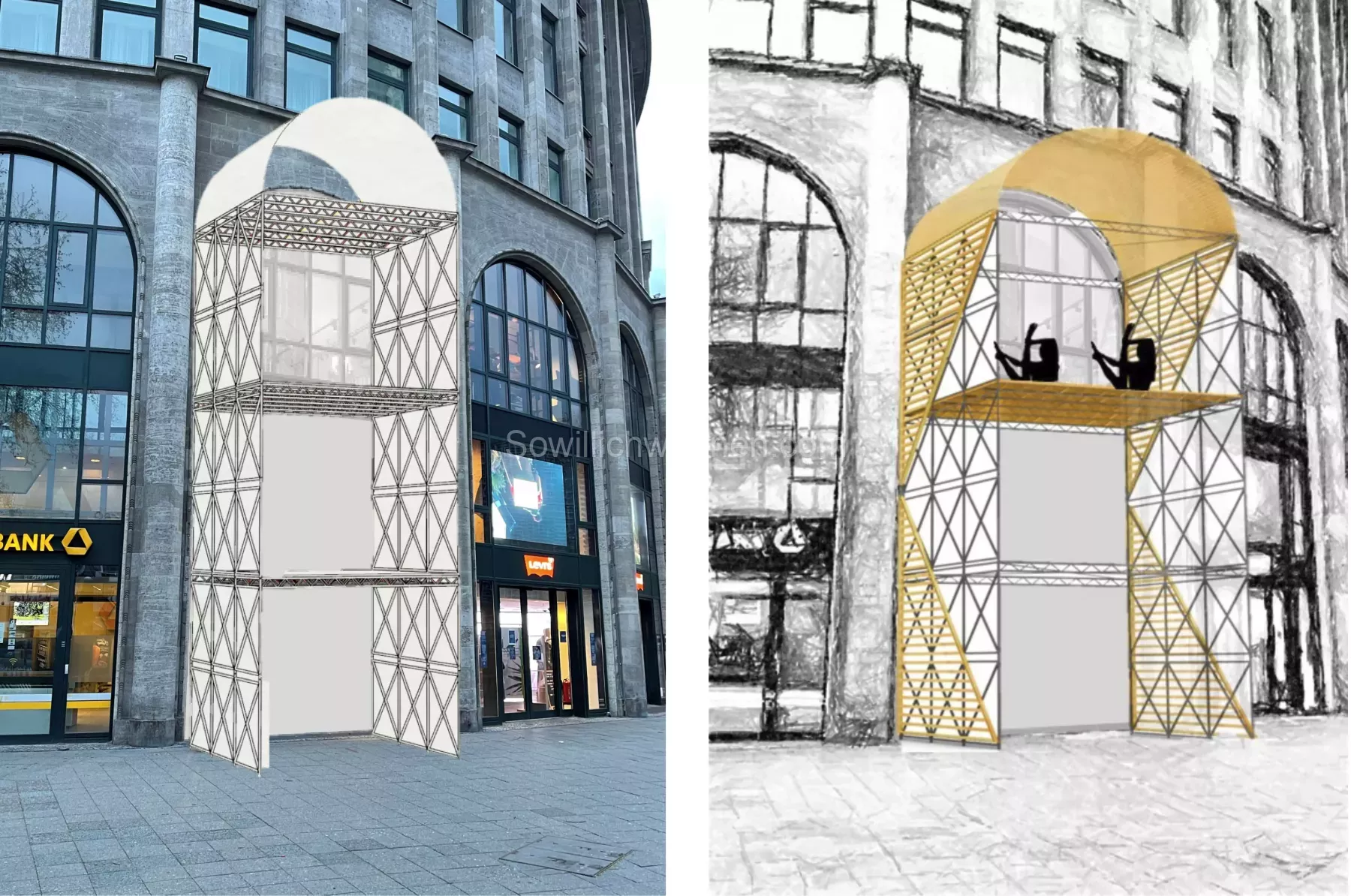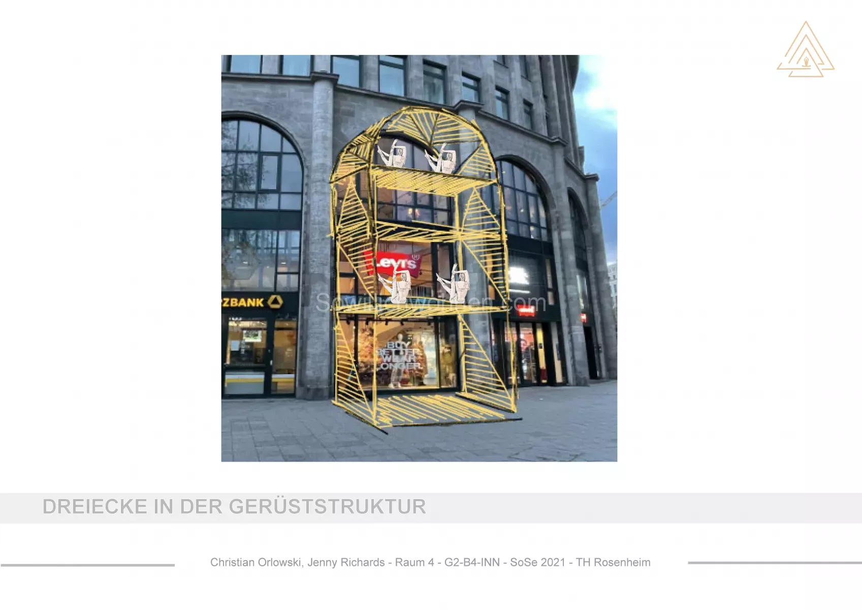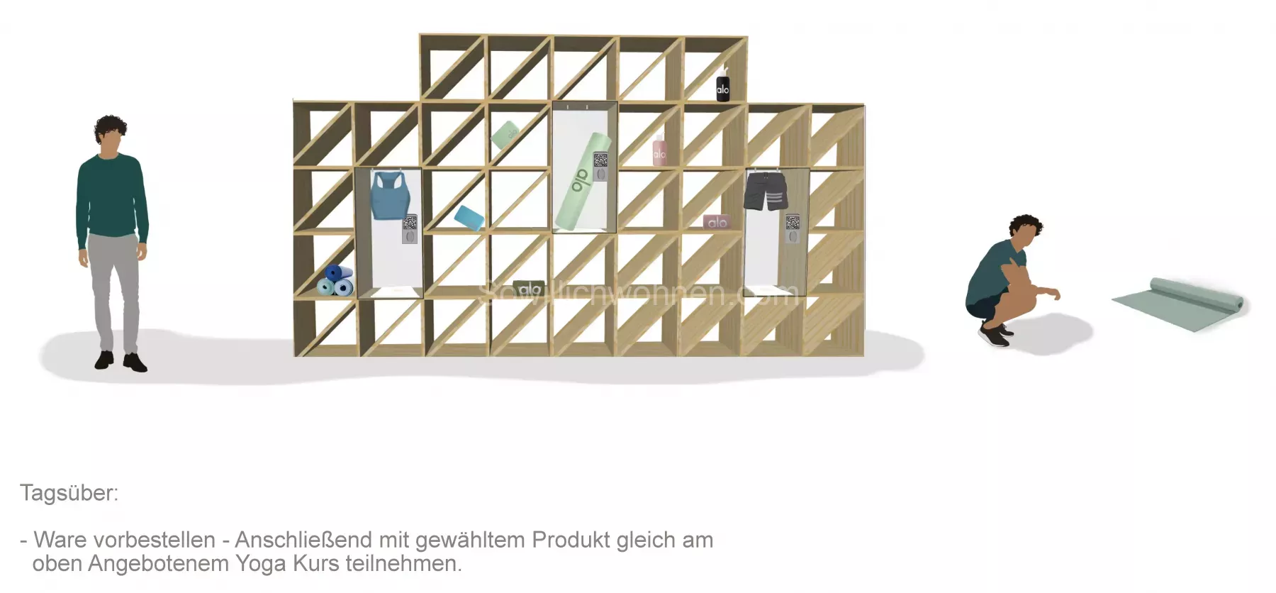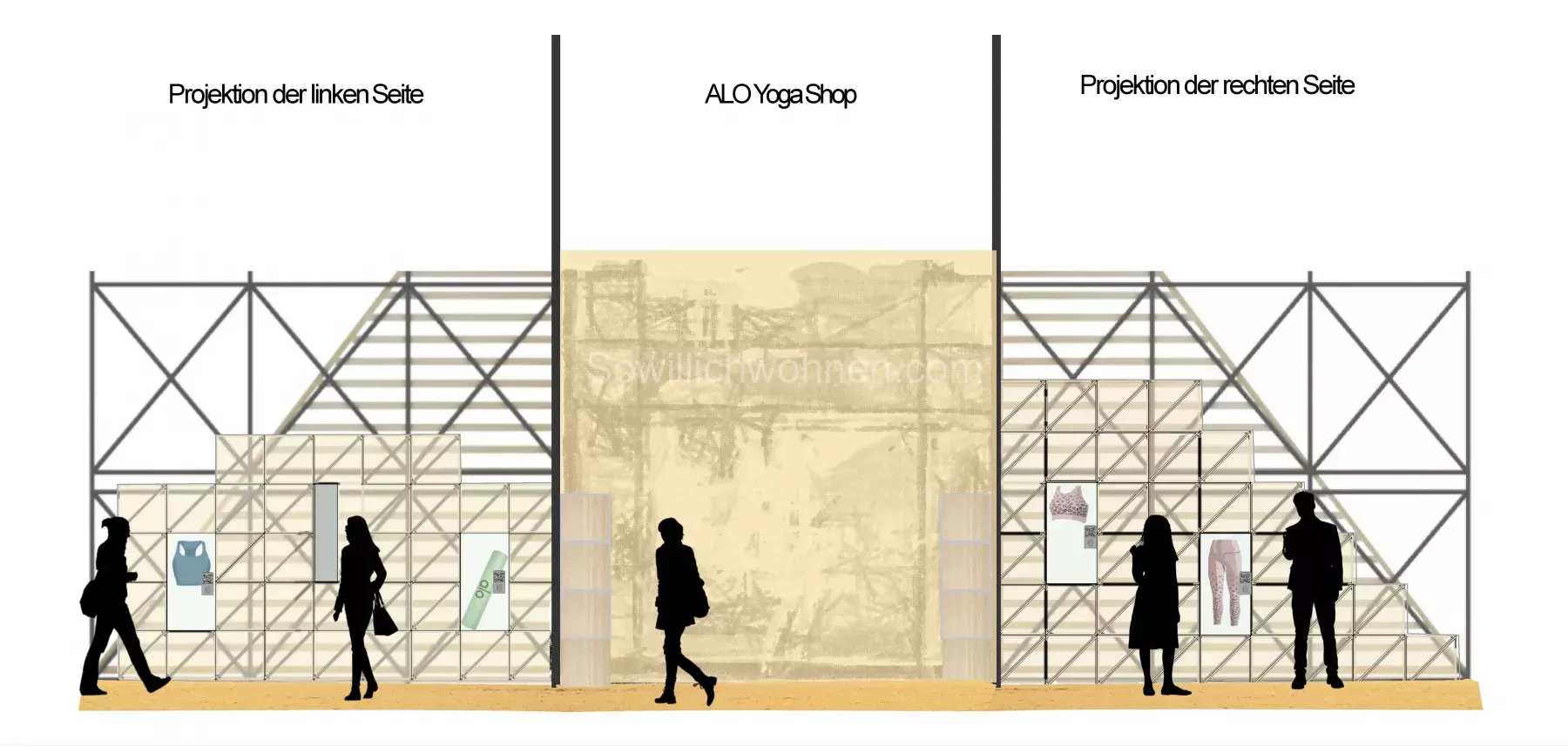 Anhand on Skizzen und Montagen präsentieren wir unseren Entwurf eines Shops von Yoga Produkten und der angegliederter Präsentationsfläche auf einem Gerüst vor dem Geschäft.