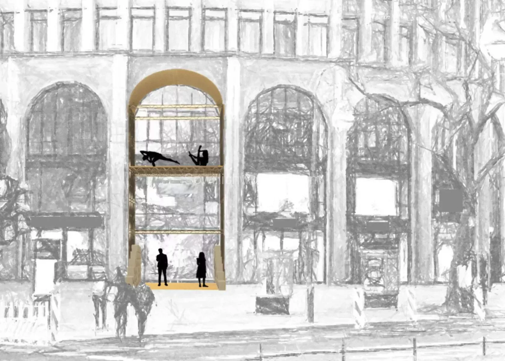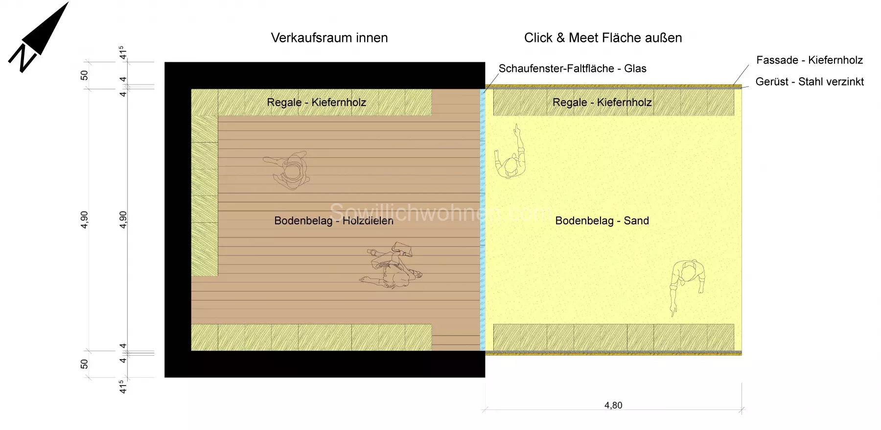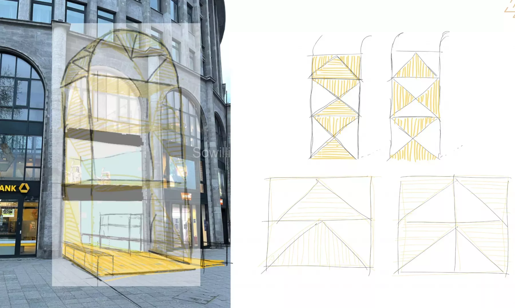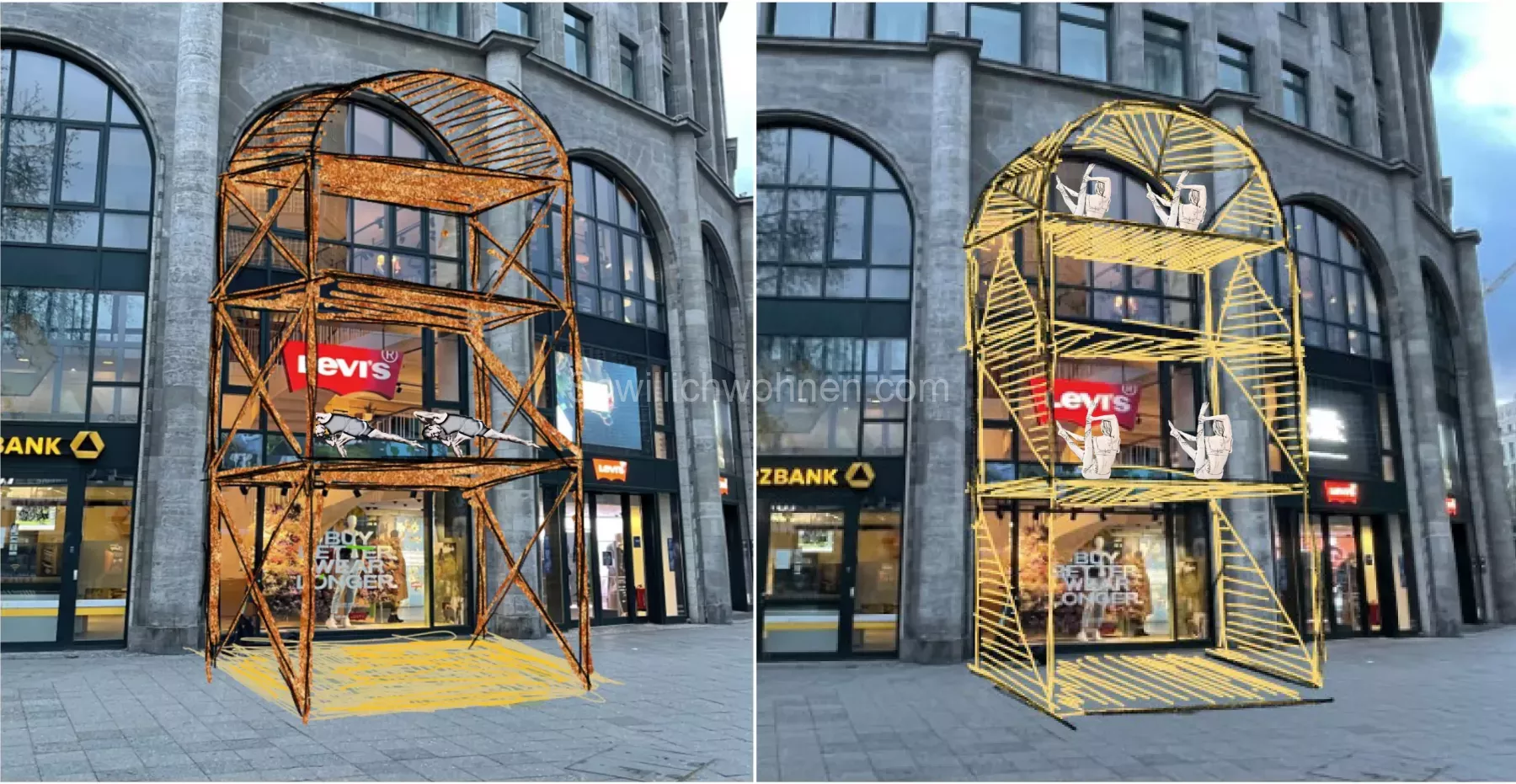 Anhand on Skizzen und Montagen präsentieren wir unseren Entwurf eines Shops von Yoga Produkten und der angegliederter Präsentationsfläche auf einem Gerüst vor dem Geschäft.