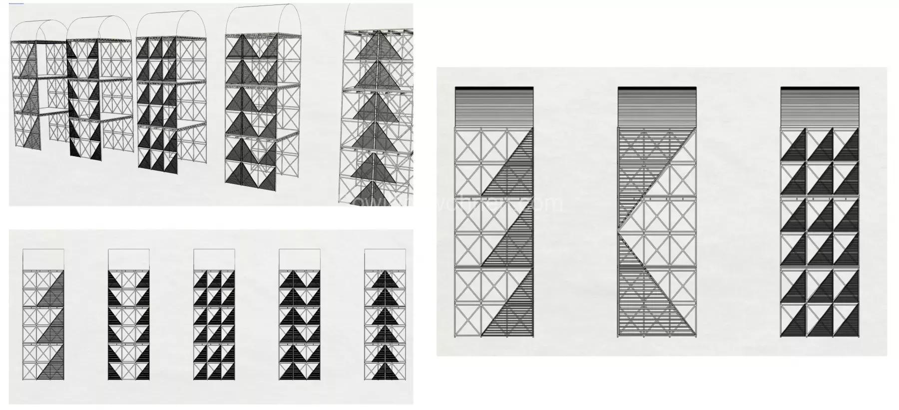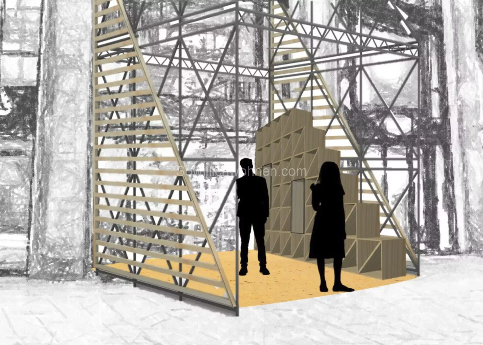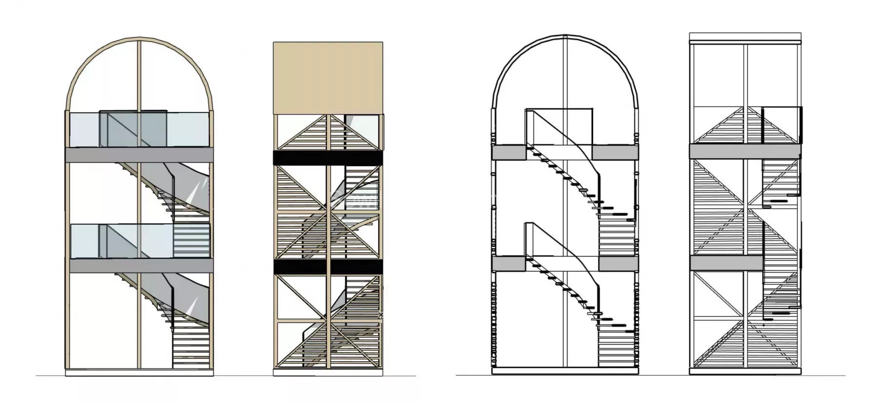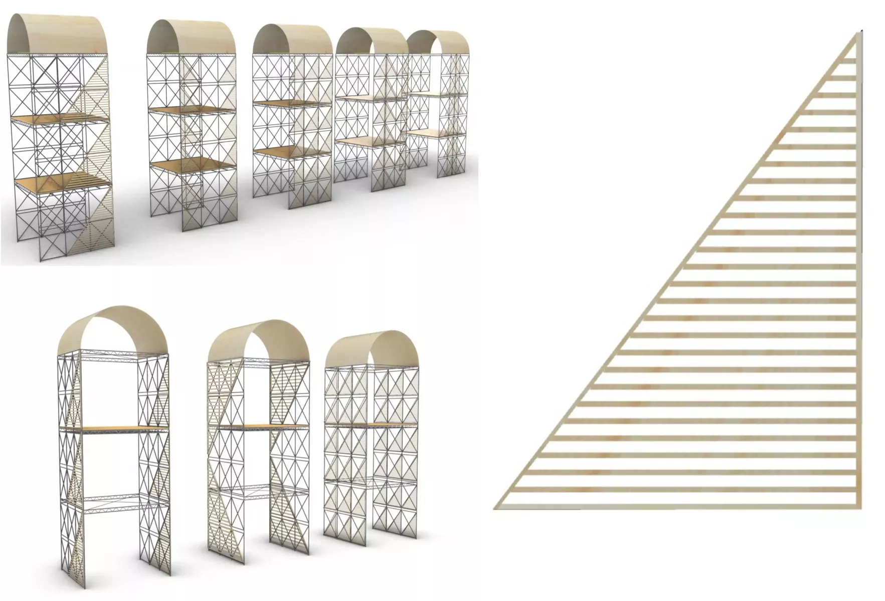 Anhand on Skizzen und Montagen präsentieren wir unseren Entwurf eines Shops von Yoga Produkten und der angegliederter Präsentationsfläche auf einem Gerüst vor dem Geschäft.