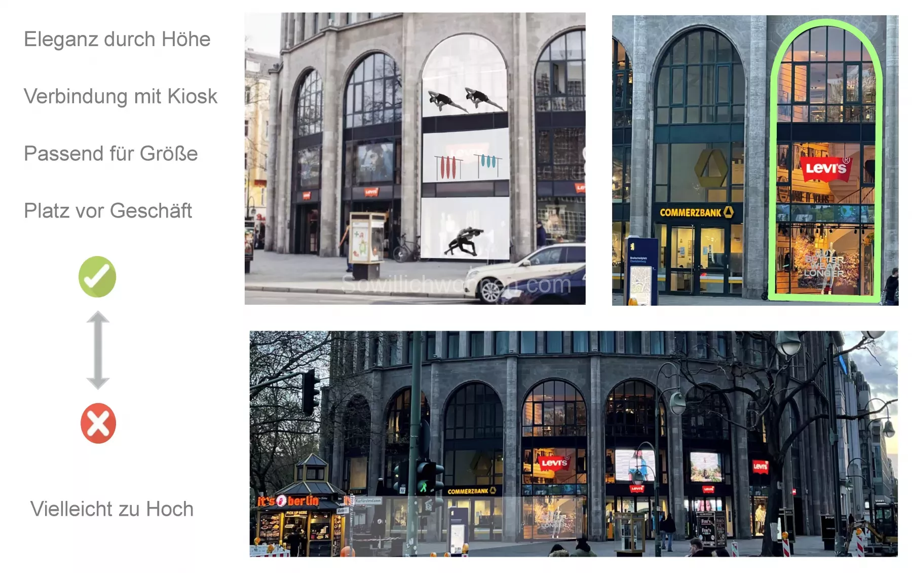 Der gewählte Standort befindet sich in Berlin am Kudamm Ecke Rankestraße. Vor dem Gebäude ist ausreichend Platz für ein Gerüst zur Präsentation der Yoga-Waren und weiteren Ebenen für Yoga Vorführungen.